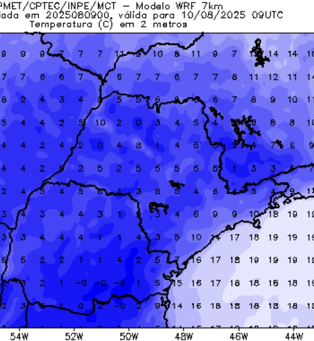 Alberto Hanauer Posted August 10, 2025 at 10:57 AM Share Posted August 10, 2025 at 10:57 AM (edited) Em 10/08/2025 em 07:44, Edison Bocorny Jr disse: Bastante frio no Mato Grosso. Fazenda Touca do Nelore sul do estado fez 7.0 graus, Primavera do Leste 8.4 e Cuiabá 10.4. Mato Grosso do Sul Fazenda Capão Bonito sudoeste do estado -1.5. Aqui fez 8.6 e deve ir a 16 a tarde. Por aqui, o ar polar chegou entre o fim da madrugada e a manhã de sábado. Apesar da mínima modesta de 11,7 °C, as rajadas de vento acentuaram bastante a sensação de frio. Porém, devido ao perfil seco da atmosfera e ao sol típico de quase segunda quinzena de agosto, a máxima alcançou os 25 °C. O auge desta massa de ar polar está previsto para ocorrer entre segunda e terça-feira. Modelos como GEM, UKMO e Meteoblue indicam mínimas entre 3 °C e 4 °C, o que, em condições ideais, já possibilitaria geada fraca em microclimas urbanos e, quem sabe, algo mais significativo em baixadas da zona rural. Mínimas do dia de hoje:10/08 Edited August 10, 2025 at 11:01 AM by Alberto Hanauer 15 Link to comment Share on other sites More sharing options...