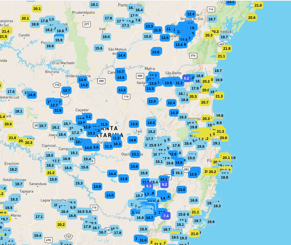 Moretão Posted September 25, 2025 at 07:08 PM Share Posted September 25, 2025 at 07:08 PM > Tarde fria para final de Setembro em grande parte de SC. Máximas de +- 2°C a 5°C abaixo da média no centro leste. > Máxima atual de apenas 7,2°C na Serra do Rio do Rastro. Será a 44ª sub-10. 15 1 Link to comment Share on other sites More sharing options...