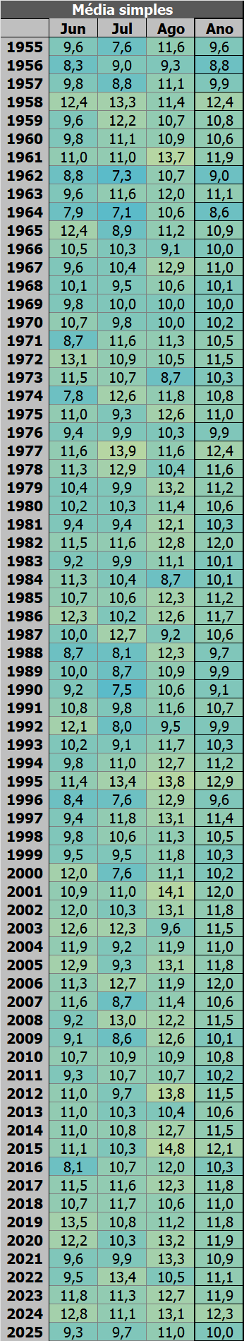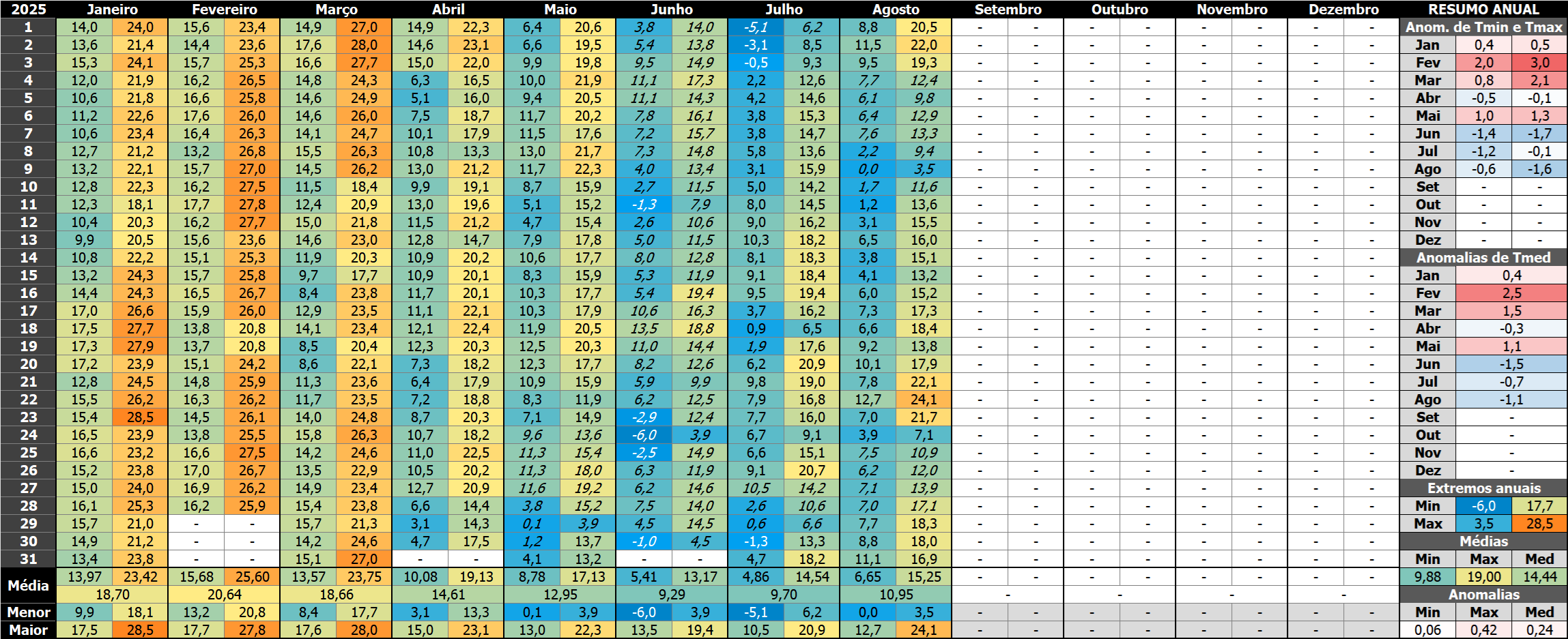 jean10lj Posted September 5, 2025 at 12:22 PM Share Posted September 5, 2025 at 12:22 PM Em 03/09/2025 em 23:58, Rodolfo Alves disse: EM MÉDIA SIMPLES, FOI O JJA MAIS FRIO EM 29 ANOS EM SÃO JOAQUIM, DESDE 1996. DADOS DA ESTAÇÃO. EM ITÁLICO, FOI USADO O DADO DA EPAGRI AUTOMATIZADA, EM RAZÃO DE DIVERSAS FALHAS NA ESTAÇÃO DO INMET ABAIXO A MÉDIA DE TODOS OS JJA O FATO CURIOSO É QUE APESAR DE SER O MAIS FRIO EM 29 ANOS, NENHUM MÊS SE DESTACOU ALÉM DOS ANOS 2009. JUNHO FOI O MAIS FRIO DESDE 2016, JULHO EMPATOU COM 2012, E AGOSTO PERDE PRA 2022. EM 1996, QUE TEVE UMA MÉDIA MAIS FRIA QUE 2025 EM SÃO JOAQUIM, JUNHO E JULHO TIVERAM ANOMALIAS FORTES DE -2,5 E -2,8ºC, QUE "COMPENSARAM" O AGOSTO MAIS RUIM. Por aqui, usando a estação do Inmet de Frederico Westphalen - RS, é o segundo JJA mais frio da estação, atrás apenas de 2009. Média JJA 2009: 14,2C Média JJA 2025: 14,4C Média JJA 2016: 14,5C Realmente muito relevante. Jamais esperaria isso em pleno 2025. Excelente! Que alento. 2025 com certeza vai deixar saudades e estaremos falando deste ano por muito tempo aqui no fórum. 21 Link to comment Share on other sites More sharing options...