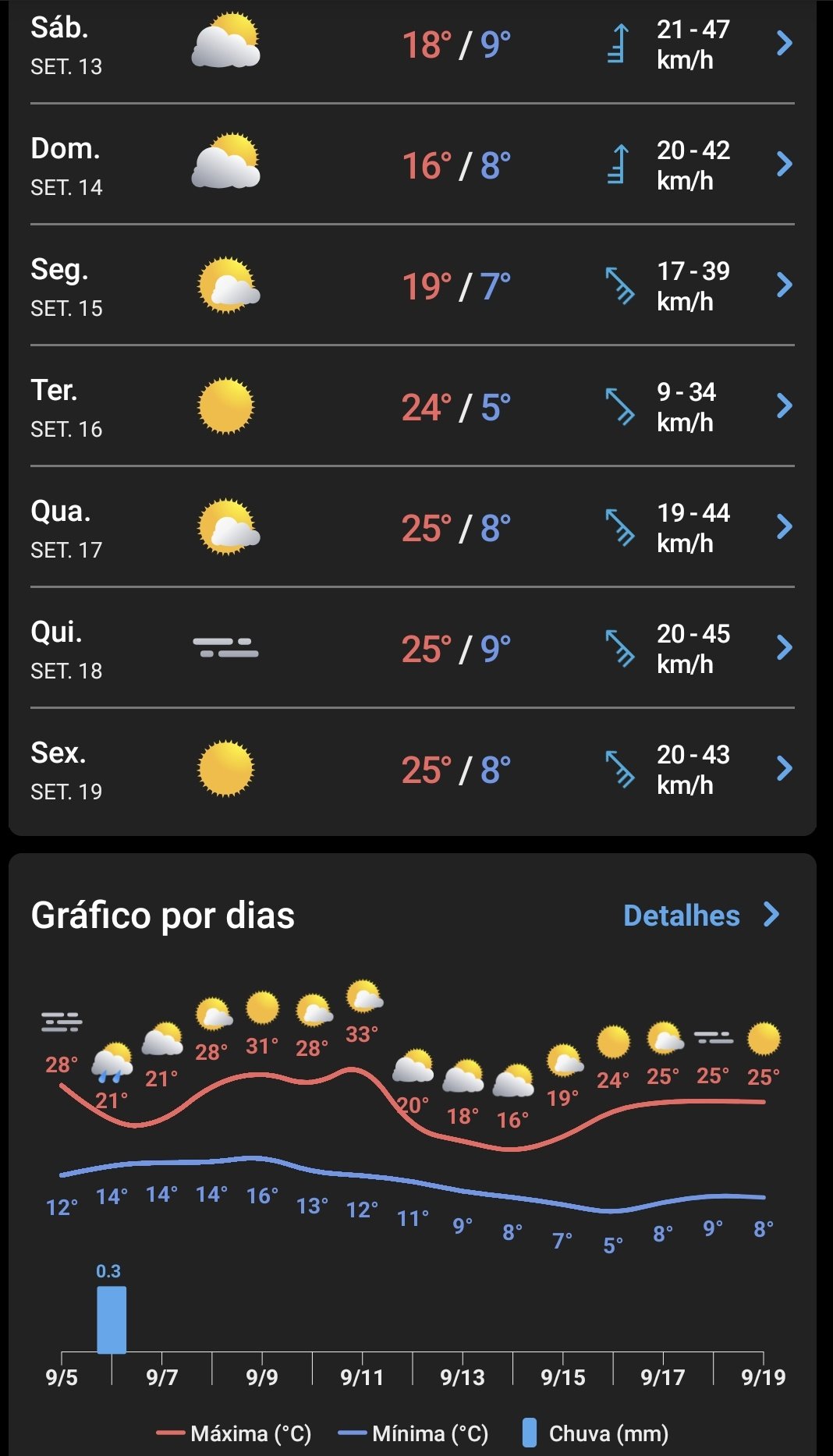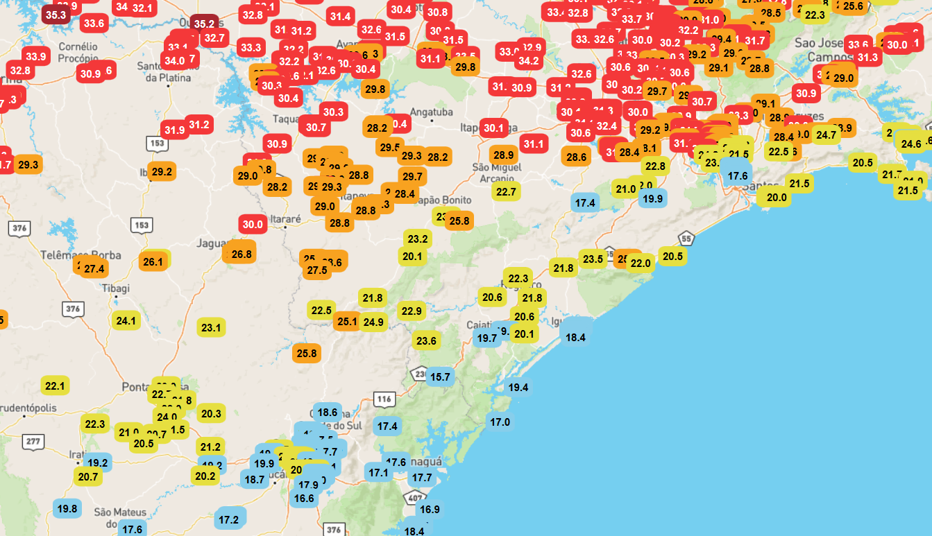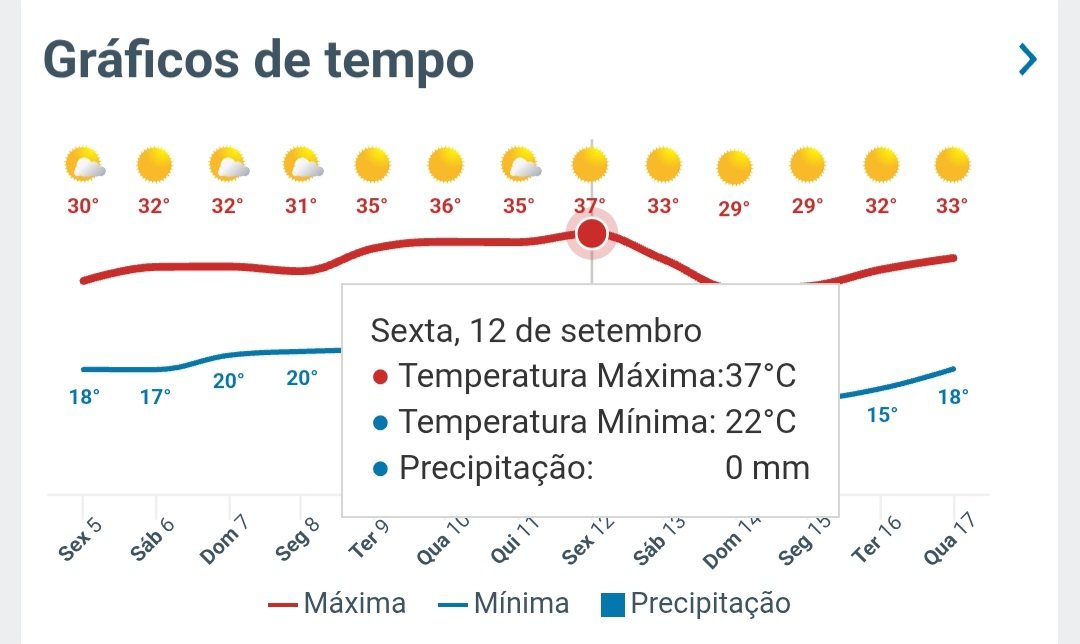 BrunoSaoPauloCapital Posted September 5, 2025 at 12:18 PM Author Share Posted September 5, 2025 at 12:18 PM Aqui em São Paulo capital, o inverno foi muito bom, pois foi constante (apesar de não termos tido aquelas mínimas extremas de 4 ºC na área urbana). E o preço desse inverno bom está vindo agora na primavera. Estamos tendo um início de primavera com temperaturas acima da normal 1991 - 2020. Ontem tivemos máxima de 29 ºC, que é aproximadamente 4 graus acima da normal de máximas para setembro (25 ºC). E os próximos 3 dias mostram que a situação está meio difícil: teremos amanhã um alívio do calor, com possibilidade de MÁXIMA de apenas 18 ºC ou 19 ºC, com o domingo também sendo friozinho leve. Porém, na segunda vem novamente o desconforto (fonte: Weather Channel): No monitoramento, às 09:17, temos aproximadamente 23 ºC em PWS da zona oeste da maior cidade do Brasil, e o meu termômetro marca 22,1 ºC. 14 Link to comment Share on other sites More sharing options...