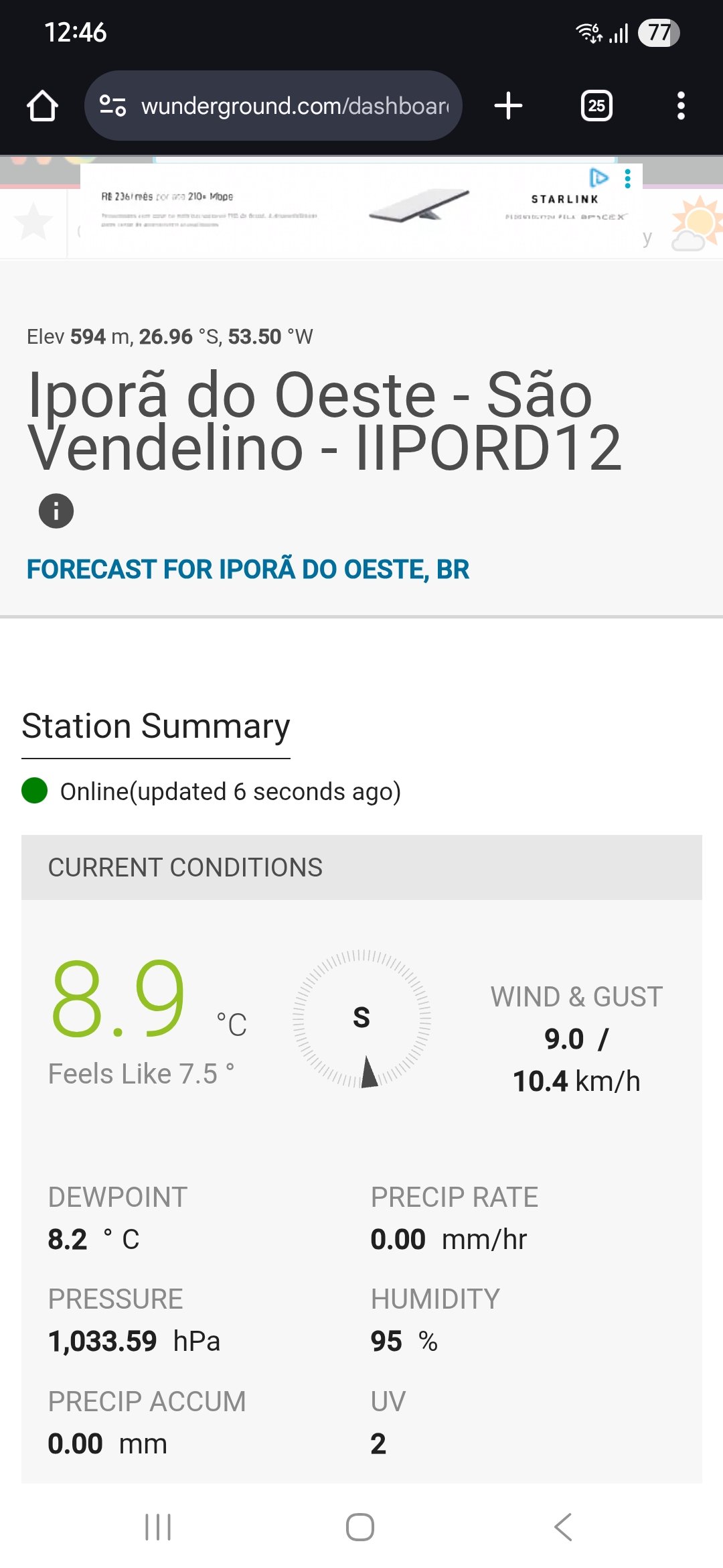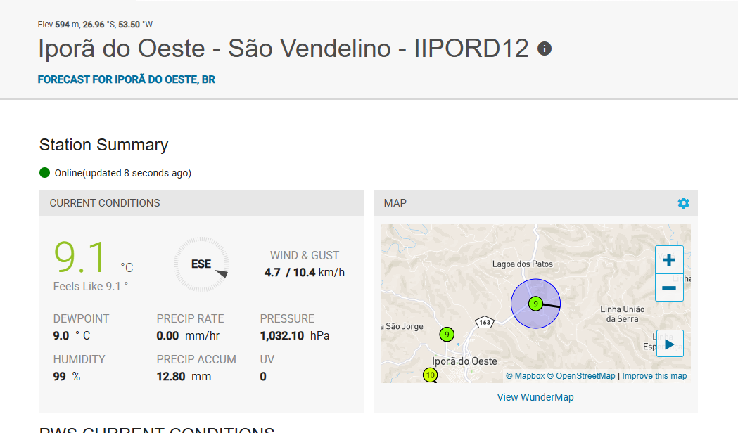 Felipe S Monteiro Posted September 5, 2025 at 05:31 PM Share Posted September 5, 2025 at 05:31 PM Bom dia, ar frio demorou pra entrar com força, e ainda fazia altos 21,2° ás 0h, estragando completamente a máxima do dia. Agora fazem 14,3° com um leve nevoeiro, eu não me lembro de nenhuma tarde tão fria assim em setembro. Mais cedo eu fui em Nova Santa Rosa, na ida eu peguei chuva em grande parte do percurso, mas lá estava seco, na volta peguei chuva de novo, passando em Palotina deu um pancadão de chuva que parecia chuva de verão. Por volta das 11h em Nova Santa Rosa: Ipês amarelos floridos na estrada. Tempo agora aqui em Altônia: Grande diferença de temperatura do oeste para o centro/norte do estado, condição parecidissima com a MP do final de agosto, ainda bem que eu não moro em Londrina, senão eu estaria com muita raiva. 20 1 Link to comment Share on other sites More sharing options...