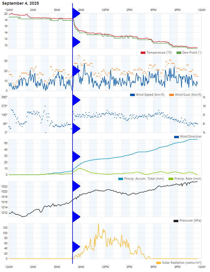 Felipe Backendorf Posted September 5, 2025 at 05:30 PM Share Posted September 5, 2025 at 05:30 PM Ontem ficamos entre 19,3/25,2ºC com 87%, vento médio de 8km/h, de norte até 14h e após isso de sul. Dia de sol, o mais quente desde fim de maio na Epagri. Hoje máxima invertida de 20,1ºC mas durante o dia faz frio: às 14h temos 15,6ºC com 85% e venta de sul a 8km/h na Epagri. Tenho a impressão que esse local pega bem mais forte o vento de norte. No aero faz 16ºC com 72% e vento de S a 22km/h com rajada de 41km/h às 14h. Sensação de bastante frio ao ar livre enquanto que os ambientes internos estão bem aquecidos ainda do calor de ontem. 18 2 Link to comment Share on other sites More sharing options...