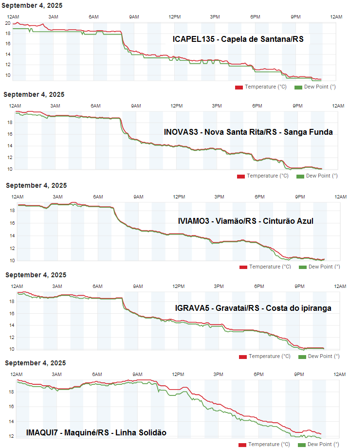 kevin cassol Posted September 6, 2025 at 06:49 AM Share Posted September 6, 2025 at 06:49 AM 05/09/2025 Recorde de menor máxima para o mês de setembro na minha rede de estações. Antiga menor marca foi destruída com margem de mais de 3°C. Dado relevante é análogo a 03/10/2020, quando teve uma menor máxima muito forte também, em um cenário similar de frente fria. Buscando dados do INMET de Porto Alegre, foi registrado hoje a máxima de 13.4°C. O último valor mais forte de máxima baixa é de 24/09/2013, quando foi registrado máxima de 13.2°C, portanto, há 12 anos não se via uma máxima baixa como a de hoje. 16 7 Link to comment Share on other sites More sharing options...