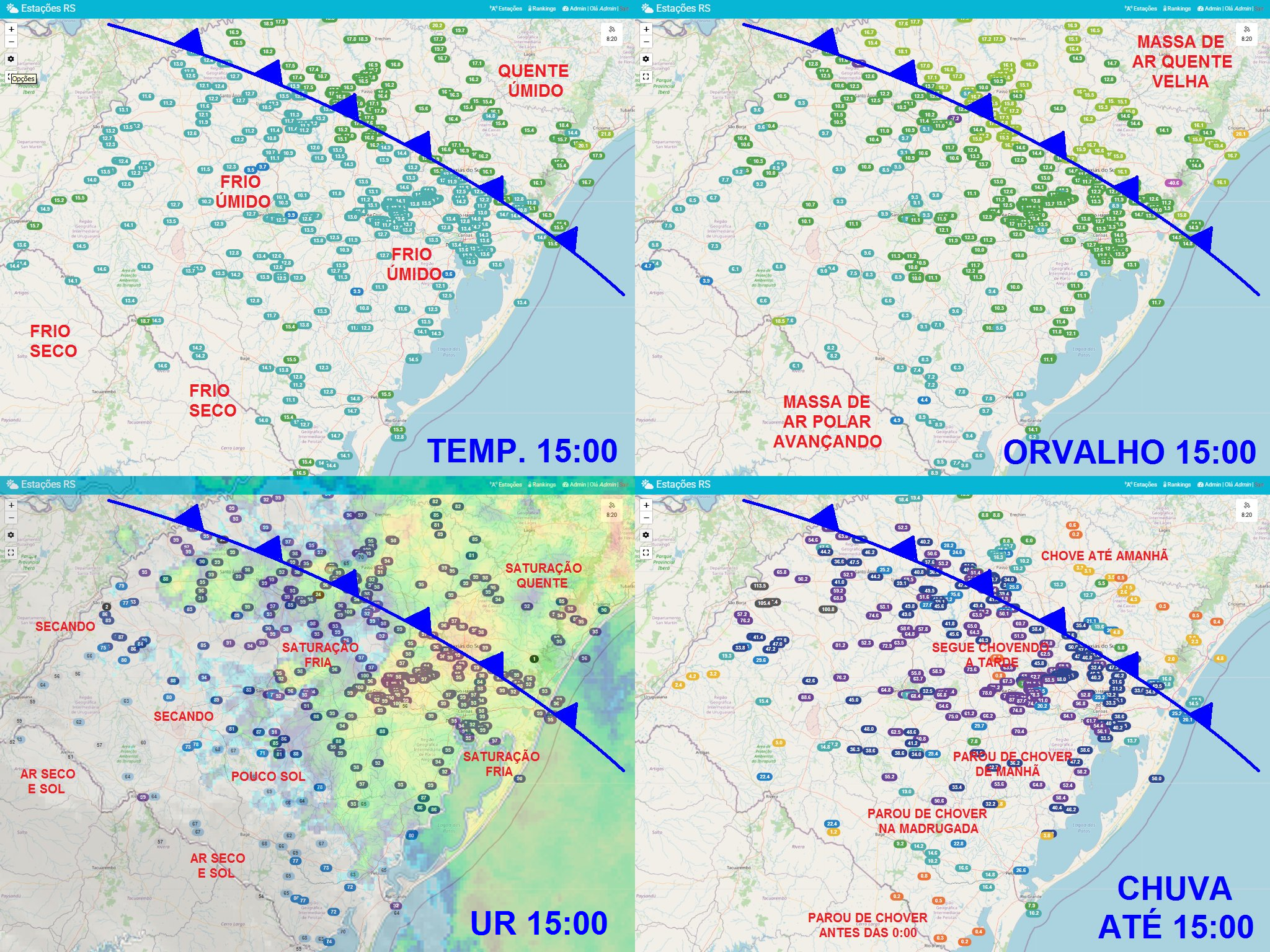 kevin cassol Posted September 5, 2025 at 02:53 AM Share Posted September 5, 2025 at 02:53 AM 04/09/2025 Frente fria bem definida cruza o Estado nesta tarde, trazendo chuva e mudança brusca na temperatura. Mapa ilustra interação da frente com as massas de ar atuantes no estado. Passagem da frente fria registrada na estação de Capela de Santana, que captou com perfeição o evento e fez esta pintura nos gráficos: Estação de Capela de Santana (foto de 29/05/2025): Gradientes são maiores nesta época. Abaixo a imagem da temperatura em 850 hPa do modelo ECMWF para a noite de hoje, ilustrando o gradiente intenso sobre o RS. Passagem da frente fria registrada em outras estações da minha rede: 18 5 Link to comment Share on other sites More sharing options...