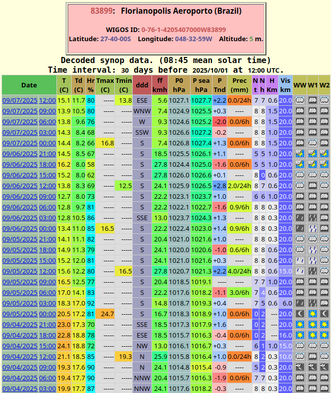 Felipe Backendorf Posted September 7, 2025 at 02:34 PM Share Posted September 7, 2025 at 02:34 PM Ontem num dia mais frio seco os extremos foram 12,8/17,3ºC em Floripa. Ventou de sul a 7km/h em média (uns 9km/h durante madrugada, manhã e tarde e parando de noite) e a umidade média foi 75%, a menor desde Julho na Epagri. A máxima foi a menor pra Setembro desde 2022. Hoje está bem menos frio, temos às 11h sol fraco entre muitas nuvens, 17,2ºC com 83% e brisa de S a 4km/h. Na espera por dias mais ensolarados a partir de terça-feira. Aero de Floripa nas últimas horas: Bastante frio com vento entre sexta-feira e ontem 16 Link to comment Share on other sites More sharing options...