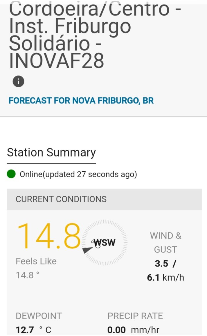 Eclipse POA Posted September 13, 2025 at 01:29 AM Share Posted September 13, 2025 at 01:29 AM Em 12/09/2025 em 21:34, Edison Bocorny Jr disse: Sexta feira ensolarada e poucas nuvens, temperatura entre 11.3 e 22.1 graus, devendo chegar a 8 amanhã de manhã ao amanhecer. Só deve trintar na quarta e quinta feira, com previsão de chuva na quinta em diante. parece haver uma chance de chuva na segunda-feira à tarde também, mas não sei se é aquelas previsões que, quando chega no dia, só nubla 10 Link to comment Share on other sites More sharing options...