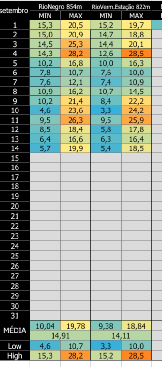 SandroAlex Posted September 15, 2025 at 12:17 AM Share Posted September 15, 2025 at 12:17 AM Em 14/09/2025 em 21:15, SandroAlex disse: Primeiras duas semanas de setembro em São Bento do Sul: Por enquanto estamos com média de 14,5°C. Ano passado setembro fechou com média de 18,7°C! 11 Link to comment Share on other sites More sharing options...