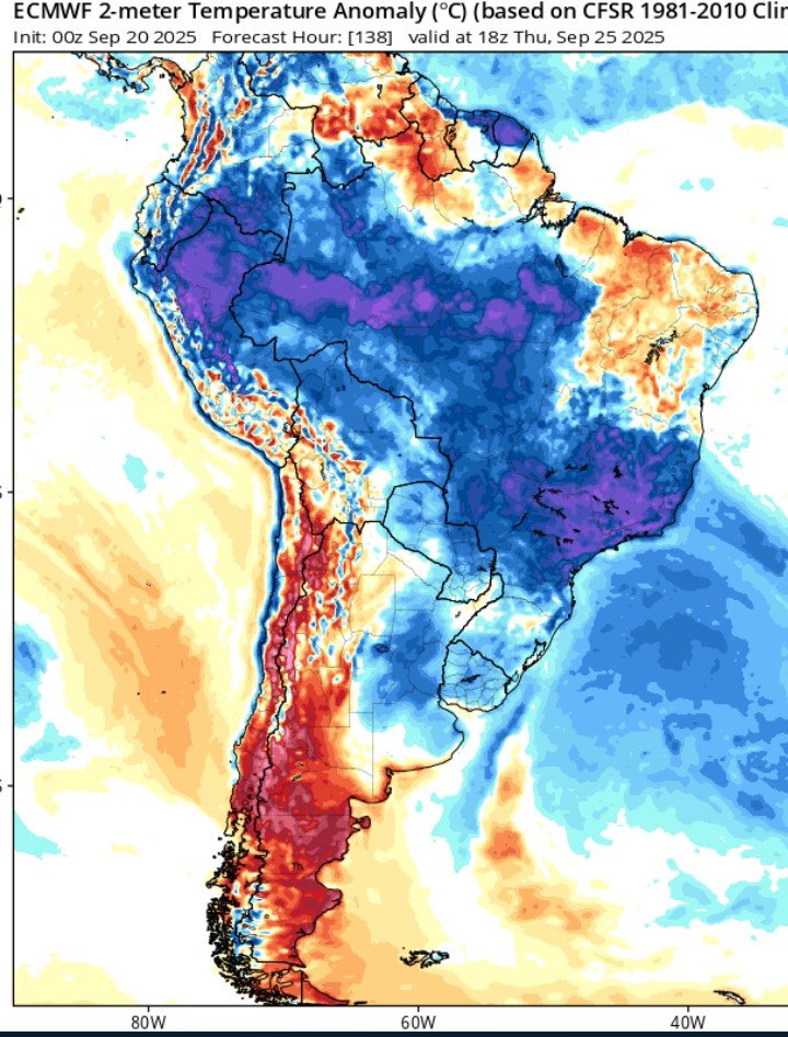 Tássio Gonçalves1515095449 Posted September 20, 2025 at 02:46 PM Share Posted September 20, 2025 at 02:46 PM E a partir de segunda feira, aqui pra SP, teremos boas emoções a começar pela excelente previsão de chuva pra cá que poderá trazer grandes volumes com períodos de tempo bastante severo em períodos pontuais com uma poderosa LI que se formará na dianteira da próxima MP... E partir de terça em diante um período considerável de frio até intenso para a época com o meteored voltando a indicar sub10 para SP em pleno final de setembro: Meteoblue No geral teremos fortes anomalias negativas essa próxima semana no sudeste, em especial dia 25: Isso só mostra o quanto setembro deste ano está destoante em relação aos dos últimos anos... Um mês de muita dinâmica com forte calor até amanhã e grande virada no tempo... 15 2 1 Link to comment Share on other sites More sharing options...