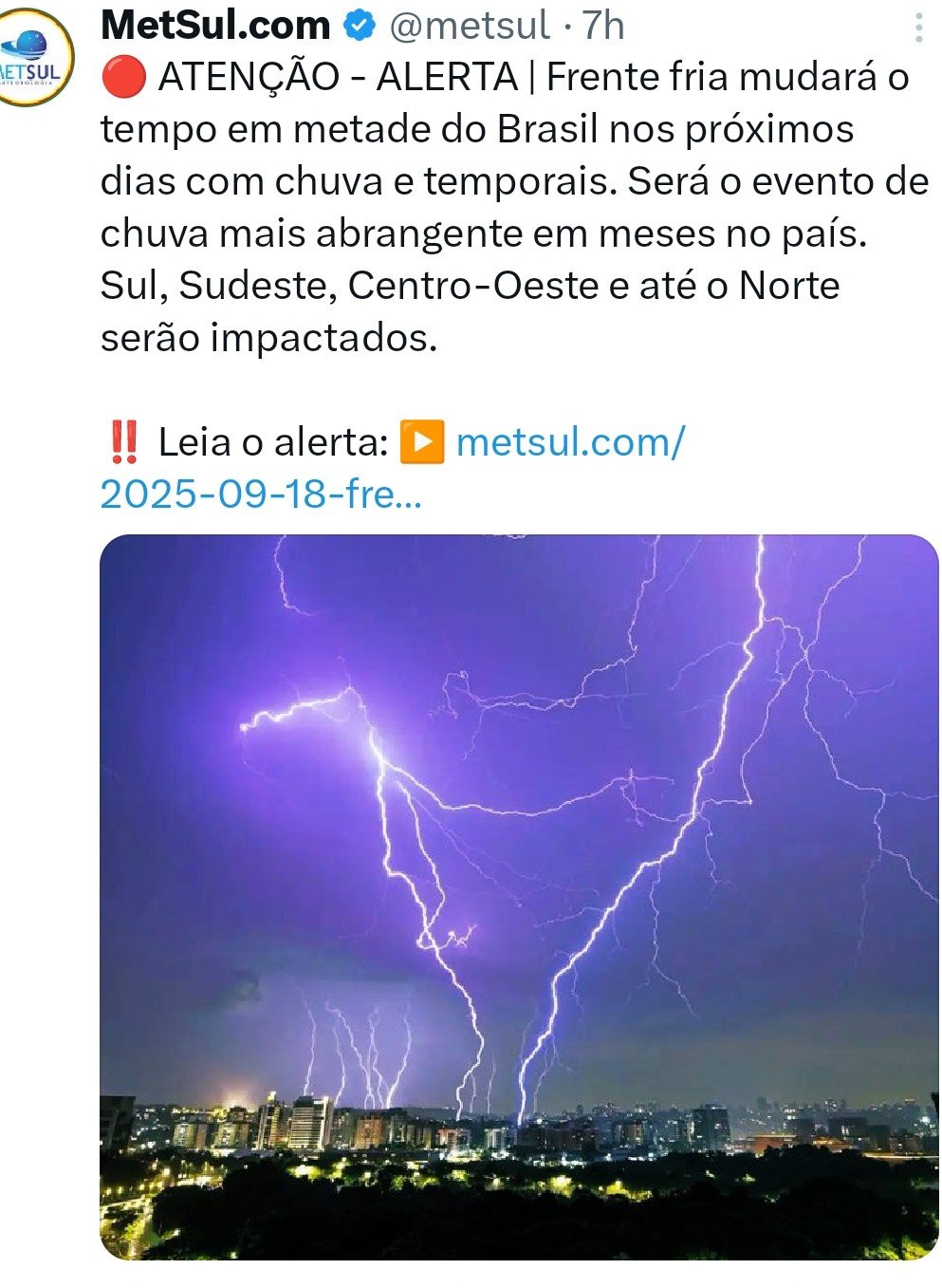 LeoP Posted September 18, 2025 at 10:34 PM Share Posted September 18, 2025 at 10:34 PM (edited) Metsul prevendo frente fria ampla e risco de tempo severo, com vendaval e granizo, em vários estados na semana que vem, inclusive no Sudeste e Centro-oeste: Deve voltar a chover em centenas/milhares de municípios do centro-norte que estão saindo do auge da estiagem. A matéria completa: https://x.com/metsul/status/1968689903140471110?t=IZBFCNGykvneEpnaL_NWOQ&s=19 Edited September 18, 2025 at 10:37 PM by LeoP 12 4 Link to comment Share on other sites More sharing options...
