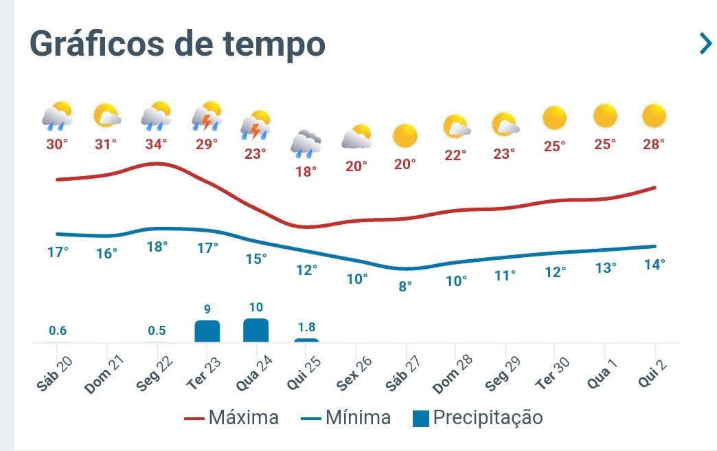Moretão Posted September 18, 2025 at 11:02 PM Share Posted September 18, 2025 at 11:02 PM > Nas áreas baixas do Vale do Itajaí foi um dia entre 16/17 de mínima, e 25/27 de máxima. Agradável na sombra, e calor no sol. Isso é que seria um dia bom de verão, não aquela coisa que fingem ser boa!! > No alto da serra, as temperaturas ainda seguiram sub-20 hoje e durante toda esta semana. Máxima de 16°C no Mundo Novo e no Rio do Rastro Eco Resort. E máxima de 18°C no Cruzeiro. > No sábado, parte de SC vai passar dos 30°C pelo Europeu. Na terça e quarta, pode negativar. 14 1 Link to comment Share on other sites More sharing options...