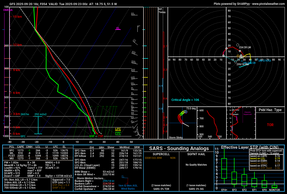 Victor G. Posted September 20, 2025 at 11:34 PM Share Posted September 20, 2025 at 11:34 PM (edited) On 9/20/2025 at 8:07 PM, Maicon said: QUE TIJOLADA O mais impressionante ainda, é que todos os modelos de previsão (ICON, GFS E ECMWF) estão indicando possibilidade de um tornado ("MRGL TOR" e "TOR") significativo (>F2) nessa área, até mesmo no sul de GO. No caso do GFS, valores de cisalhamento em 0-1 km em mais de 30 nós (kt), pontos de orvalho suficientemente altos e helicidade relativa de tempestade em todos os sub-parâmetros sendo acima de 250. Até mesmo os parâmetros de ESTP (effective layer significant tornado parameter) estão indicando valores altos em praticamente tudo (LCL, CAPE, etc). A única limitação está na falta de catalisadores para iniciação convectiva. A primeira imagem a seguir é para a região próxima de Panorama, na divisa com o MS. A segunda imagem é do extremo sul de Goiás. Impressionante como valores tão altos chegam até no estado de GO. Edited September 20, 2025 at 11:51 PM by Victor G. 14 1 Link to comment Share on other sites More sharing options...