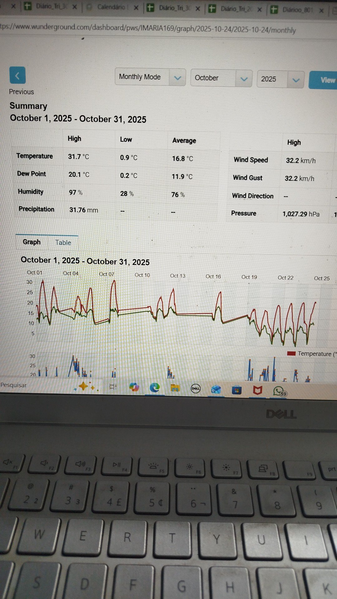 Serrano Posted October 29, 2025 at 05:54 PM Share Posted October 29, 2025 at 05:54 PM Tarde fria e úmida com 12,6°C em Urubici/VG às 14 hrs. Outubro até aqui: Os 3 primeiros dias completei com uma estação próxima. Mínima absoluta de outubro menor do que a de setembro, algo incomum. 15 Link to comment Share on other sites More sharing options...