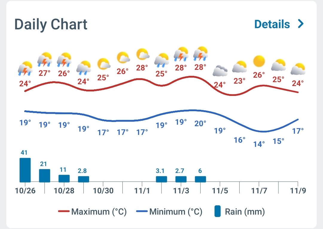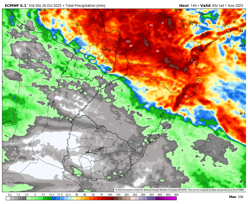 Felipe S Monteiro Posted October 26, 2025 at 12:05 PM Share Posted October 26, 2025 at 12:05 PM Bom dia, no Paraná, aqui foi um dos locais menos influenciados por essa última MP, no pico, houve uma máxima de 25° com sol na segunda, seguida de uma mínima horária de 13,1° na terça, no dias posteriores foi só aquecendo, com ontem batendo os 34°. A parte boa é que a MP secou o tempo, depois dos 200mm da semana anterior. Ontem à noite a chuva retornou, com alguns raios no começo, mas sem transtornos. Foram 44,2mm. Agora fazem 19,6° com céu nublado, mas é possível ver algumas aberturas no horizonte. Grade do meteored, a MP que vai vir essa semana é fraquíssima. 17 Link to comment Share on other sites More sharing options...