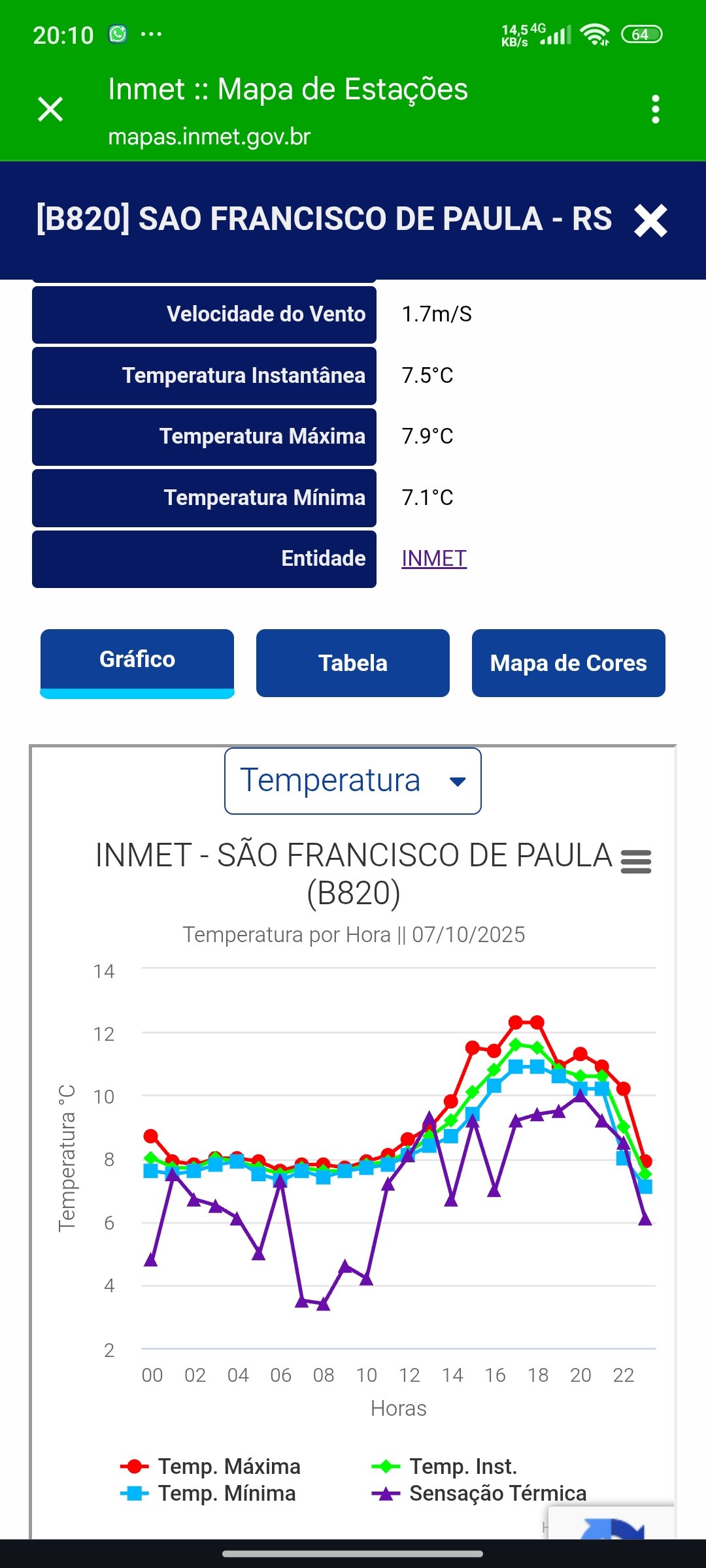 Edison Bocorny Jr Posted October 7, 2025 at 01:11 AM Share Posted October 7, 2025 at 01:11 AM (edited) A máxima aqui foi por volta da meia noite, com 25.9 graus e agora é a mínima do dia 14.2 graus. Choveu bem na madrugada até o amanhecer, permanecendo fraca a tarde e início de noite, com períodos de encoberto sem precipitação. Amanhã o sol aparece a tarde e não deve passar dos 21 graus, bastante frio na quarta de manhã, com 7 graus de mínima previsto, mas acredito em 8 ou 9. Edited October 7, 2025 at 01:12 AM by Edison Bocorny Jr 12 Link to comment Share on other sites More sharing options...