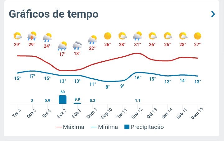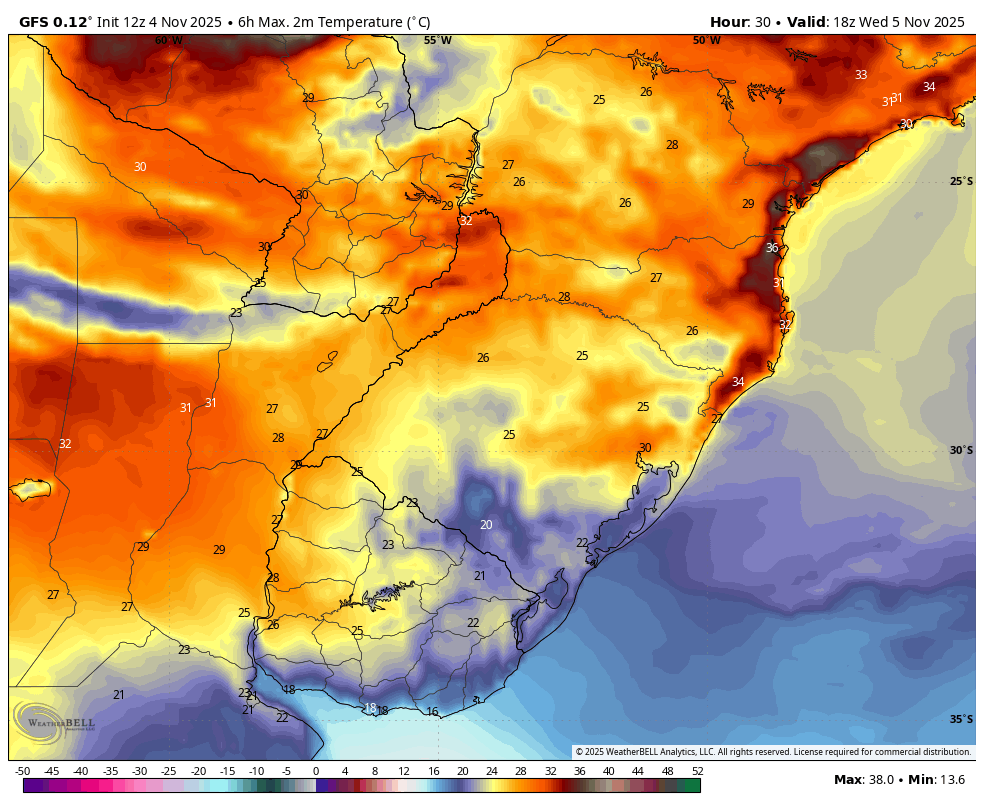 Edison Bocorny Jr Posted November 4, 2025 at 12:36 AM Share Posted November 4, 2025 at 12:36 AM (edited) E mais outro dia de primavera, céu encoberto, aberturas de sol a tarde e temperatura entre 16.5 e 24.9 graus. A chuva deve retornar quarta a tarde e chover forte com ventania na sexta, mas a última atualização reduziu o volume de chuva absurdo e velocidade do vento aqui. A perspectiva e de que chegue nos 30 graus a máxima amanhã. Edited November 4, 2025 at 12:36 AM by Edison Bocorny Jr 12 Link to comment Share on other sites More sharing options...