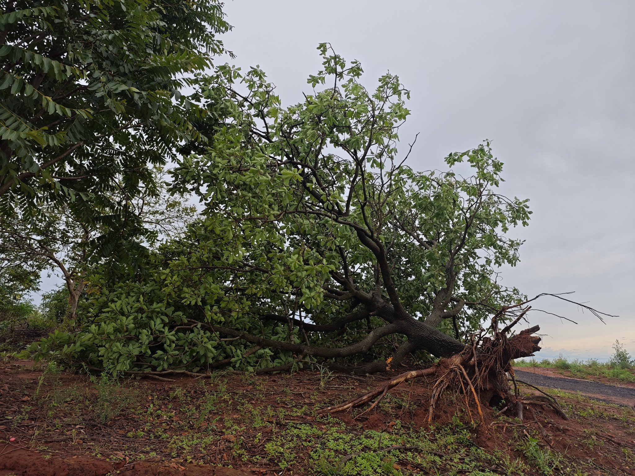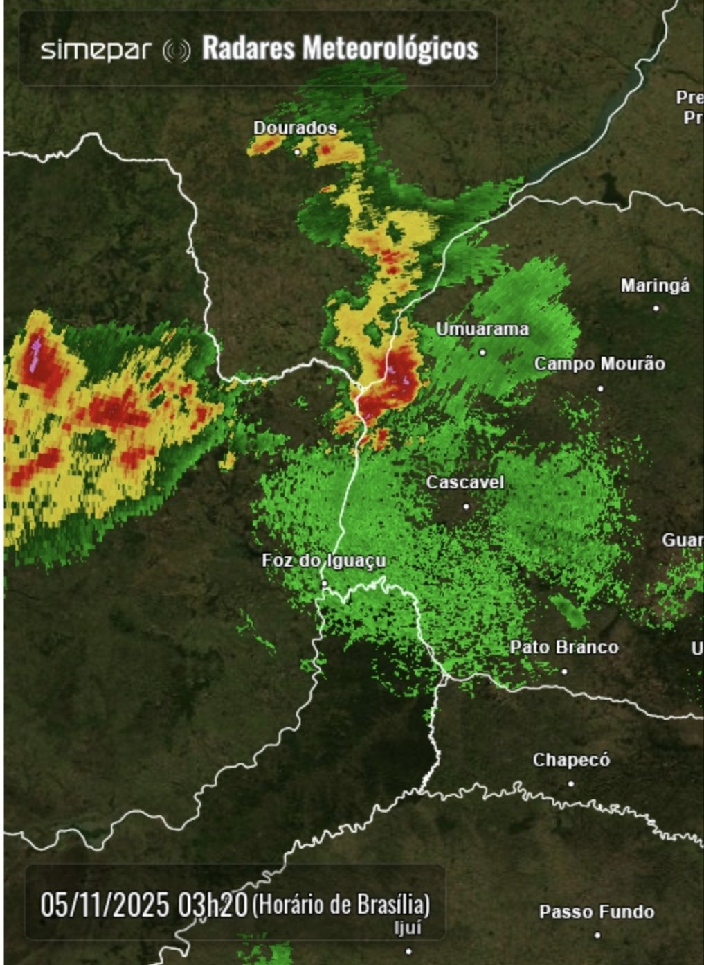 Felipe S Monteiro Posted November 5, 2025 at 03:50 PM Share Posted November 5, 2025 at 03:50 PM Bom dia, ontem foi um dia com uma manhã muito abafada e tarde muito quente, com mínima de 22° e máxima de 35°, foi a máxima mais alta desde o dia 05/10. De tarde algumas CBs isoladas se formaram: De madrugada, uma forte instabilidade chegou por aqui, imagem de radar da hr em que estava aproximando, com alguns pontos chegando na refletividade máxima. A estação de Altônia teve rajadas de 92km/h, acumulou 37mm. Teve granizo miúdo em alguns lugares próximos. Vídeo da ventania: VID_20251105_123222_1.mp4 Logo depois, o mamoeiro que aparece no final do vídeo caiu. Uma árvore arrancada a poucos metros de casa: Essa primavera tem tido vários episódios de tempo severo, talvez já é a mais "movimentada" desde 2021. Sexta-feira promete mais tempestades. 16 Link to comment Share on other sites More sharing options...