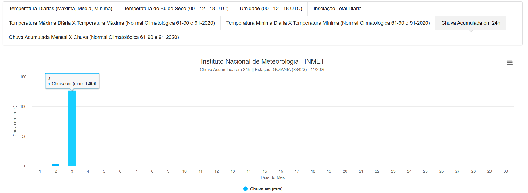 Alexandre Pereira Posted November 6, 2025 at 12:17 AM Share Posted November 6, 2025 at 12:17 AM Boa noite BAZ! Não sei se foi comentado aqui a chuva entre domingo e segunda em Goiânia que acumulou 126mm, foi muita água mesmo e em 1 único dia de chuva tivemos maior acumulado que todo o período de Maio a Setembro! Fico chateado de não ter os dados da estação automática enquanto ela está sem reportar, então seguimos com a convencional por enquanto: Hoje teve mais chuva forte e o acumulado do mês pode ser bem grande se seguir assim... 14 Link to comment Share on other sites More sharing options...