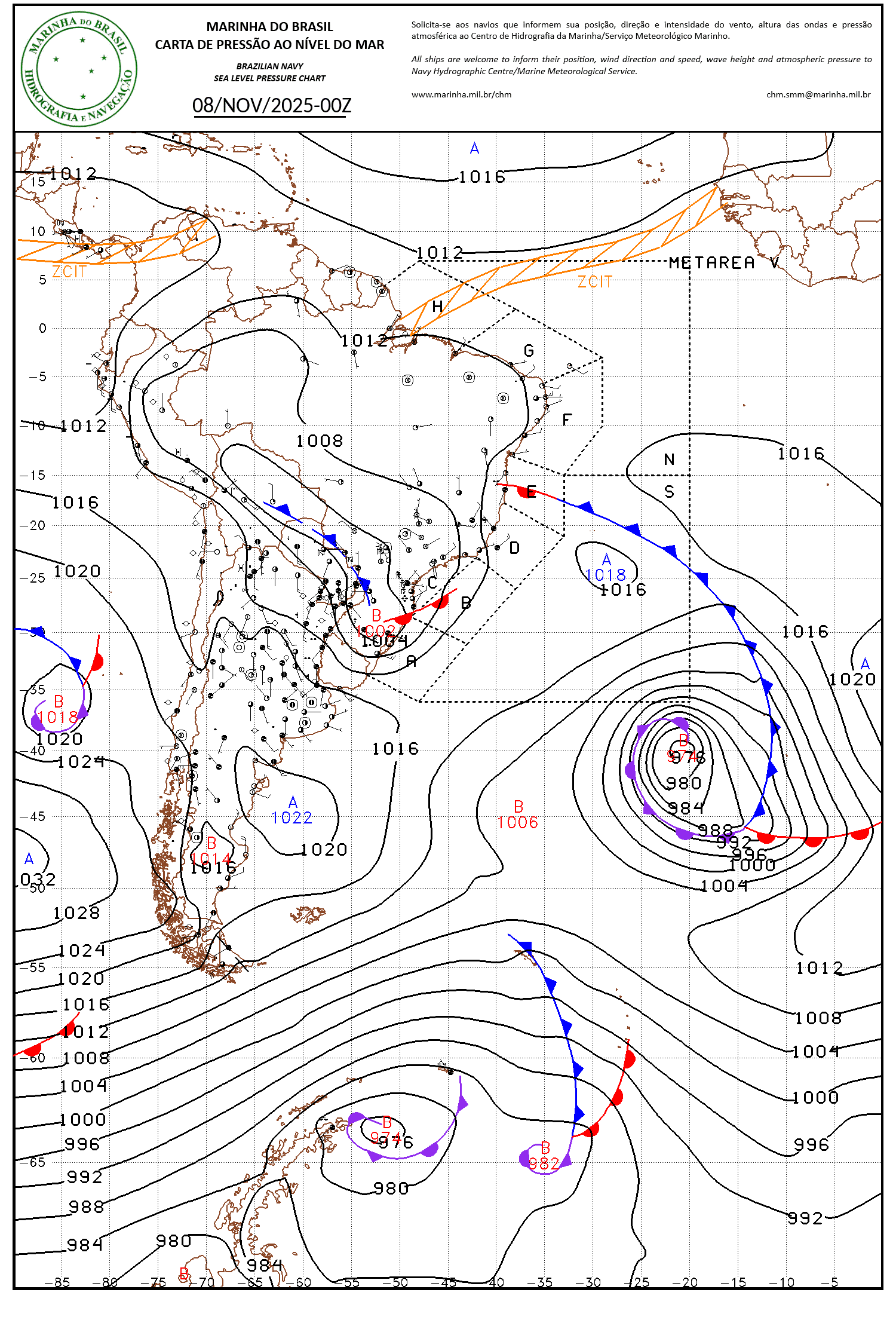 Felipe Backendorf Posted November 8, 2025 at 12:01 PM Share Posted November 8, 2025 at 12:01 PM Carta da marinha ontem 21h com a baixa pressão ainda no continente: Choveu 45mm e a temperatura ficou entre 17,1ºC e 20,2ºC em Blumenau ontem com vento de E. A pressão ao nível do mar atingiu pico mínimo de 1000Hpa hoje no amanhecer (5:30) com fino nevoeiro mas céu já azul. Agora o ciclone já está sobre o oceano e os ventos passaram a soprar de O. Às 9h faz 22,6ºC com 74% e vento de O a 7km/h, céu nublado com nuvens correndo rápido de oeste. Nas próximas horas o vento continental ganha força causando aquecimento adiabático e de tarde, com o afastamento do ciclone para a costa do RJ, o vento de SE vai causar queda de temperatura. Grande diferença de temperatura às 9h em SC: 7,8ºC Morro das Torres com OSO a 42km/h 12,9ºC Lages/INMET com O a 18km/h 24ºC em Navegantes/aero com O soprando a 35km/h 26ºC em Florianópolis/aero com vento de O a 15km/h 12 Link to comment Share on other sites More sharing options...