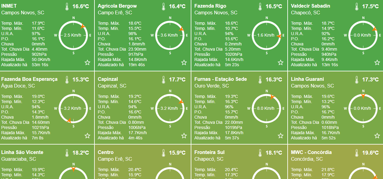 Felipe Backendorf Posted November 14, 2025 at 11:56 AM Share Posted November 14, 2025 at 11:56 AM Ontem e anteontem tivemos dias com a cara de Novembro na capital catarinense: Quarta-feira foi um dia nublado com temperatura entre 18,9ºC e 24,0ºC. Ventou de N a 6km/h com UR média de 80%. Ontem tivemos céu nublado temperatura entre 19,1ºC e 26,3ºC. Ventou de SE a 6km/h com UR mais alta, em 86%. Ambos dias tiveram radiação ~200W/m². Hoje temos um dia de sol entre nuvens altas, faz 21,5ºC com 79% e sem vento às 8h na Epagri. 10 Link to comment Share on other sites More sharing options...