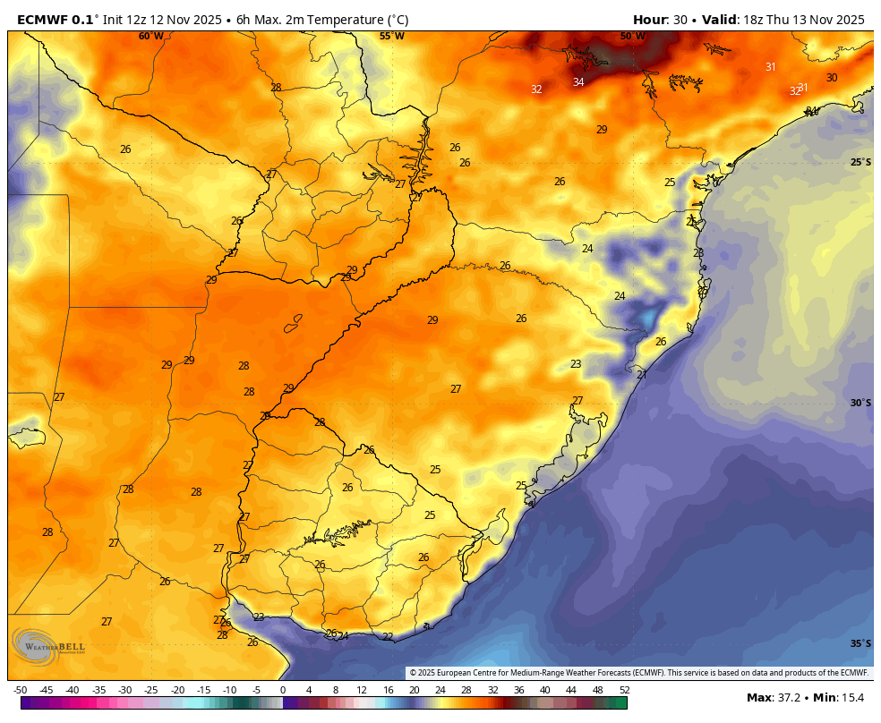 Moretão Posted November 12, 2025 at 11:04 PM Share Posted November 12, 2025 at 11:04 PM > Ontem um dia com amplitude de até 26°C em São Joaquim. > Hoje a amplitude caiu para 18,4°C (4,5°C/22,9°C) em Bom Jardim da Serra. > Ficou muito quente apenas no sul do estado. Máxima de 32,45°C em Criciúma. > No oeste, ao contrário as máximas ficaram baixas para a época. > Pelo europeu, amanhã o calorzinho fica mais distribuído. Menos quente no sul e mais quente no oeste. 12 Link to comment Share on other sites More sharing options...