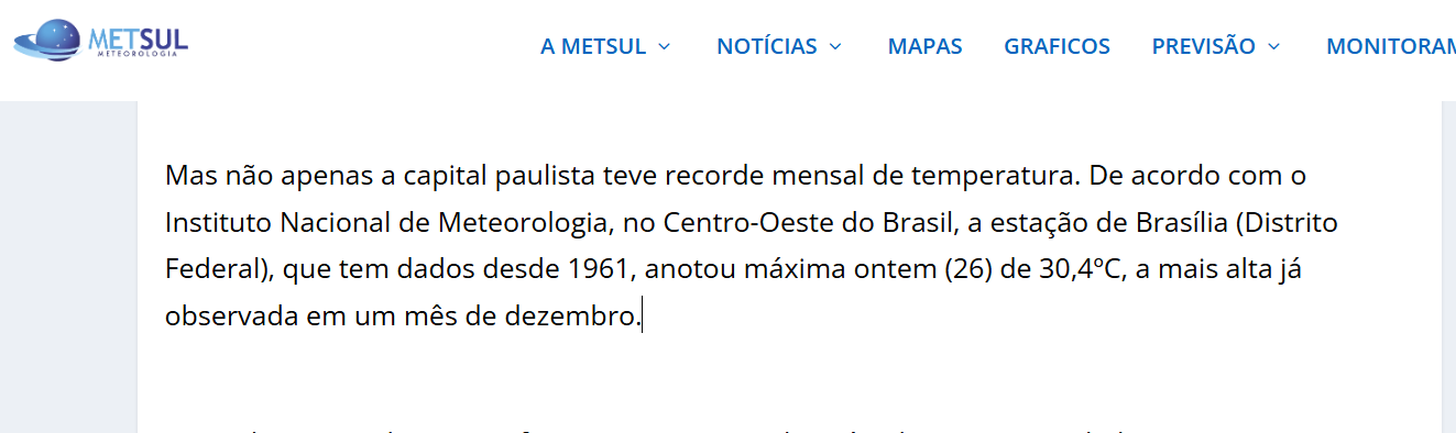 Rodolfo Alves Posted December 27, 2025 at 01:56 PM Share Posted December 27, 2025 at 01:56 PM ESTA INFORMAÇÃO PUBLICADA NO SITE DA METSUL, COM DADOS AO QUE PARECE INFORMADOS PELO INMET, NÃO PROCEDE. NÃO HOUVE RECORDE EM BRASÍLIA. UMA RÁPIDA CONSULTA NO SITE DO BANCO DE DADOS DO INMET (BDMEP) MOSTRA QUE O RECORDE DE DEZEMBRO É DE 33,7ºC DE 1963, E SENDO QUE HÁ VÁRIAS OUTRAS MÁXIMAS ACIMA DO VALOR DE ONTEM NA SÉRIE. 9 1 Link to comment Share on other sites More sharing options...