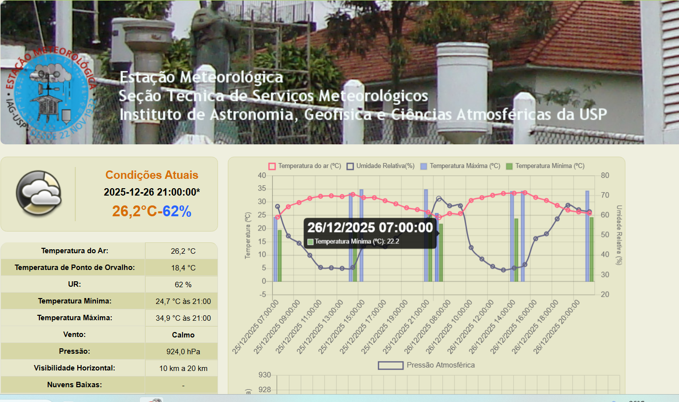 Rodolfo Alves Posted December 27, 2025 at 01:51 AM Share Posted December 27, 2025 at 01:51 AM COM A LEITURA DA NOITE, O IAG TEVE HOJE A MÍNIMA 22,2ºC. ESSA FOI UMA DAS 5 MAIORES MÍNIMAS DIÁRIAS PARA DEZEMBRO EM 92 ANOS. ESTAÇÃO DO IAG - MAIORES MÍNIMAS EM DEZEMBRO (1933-2025) 22,7ºC - 17/12/1987 22,6ºC - 21/12/2014 22,5ºC - 31/12/2013 22,4ºC - 16/12/1993 22,2ºC - 26/12/2025 6 5 Link to comment Share on other sites More sharing options...