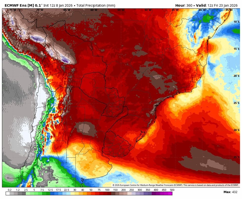 marinhonani Posted January 8, 2026 at 12:17 AM Share Posted January 8, 2026 at 12:17 AM Em 07/01/2026 em 09:40, Renan disse: ECMWF, na rodada 00Z, voltou atrás quanto às chuvas e resolveu aumentar bastante os volumes. Agora o acumulado 15 dias está assim: Salienta-se que está mudando a cada rodada. Renan, na torcida para as chuvas voltarem, no fim de semana ou no dia 12. Espero que não tenha outro bloqueio, tipo o que começou no Natal. E que janeiro, chova bem acima do normal e não fique mais de 5 dias seguidos sem chuva. Amigos e parentes, ficaram apavorados com essa última onda de calor com umidade muito alta, pessoas juntaram nos quartos para dormir com o ar ligado, onde tinha somente um ar. Aqui em casa, 5 noites seguidas de muito calor, do dia 30 ao dia 3. Dormi na copa/sala, com uma janela enorme aberta e a porta no lado contrário aberta, com isso circulava o ar mais fresco do quintal. No dia mais quente na copa/sala, medi 31 graus e umidade 65%, chegava a noite, a temperatura estava ás 21 h em 30 graus, mas ia baixando devagar, até os 26 graus num dia e na amanhecer mais quente, medi 26,5 de mínima dentro de casa. Enquanto estava quente, eu ligava o circulador turbo Arno na velocidade média, com isso não suava. Ás 6 h 30 da manhã, fechava todas as janelas e porta, para manter o ar fresco da madrugada e não deixar o bafo da rua e da área interna, esquentar tudo. No horário de 13 h 30, abria a janela de um quarto virado para o quintal para medir a máxima do dia. No dia mais quente, dia 01/01/26, medi 40,0 graus na janela da rua e na copa/sala, medi 31,0 graus. 10 1 Link to comment Share on other sites More sharing options...