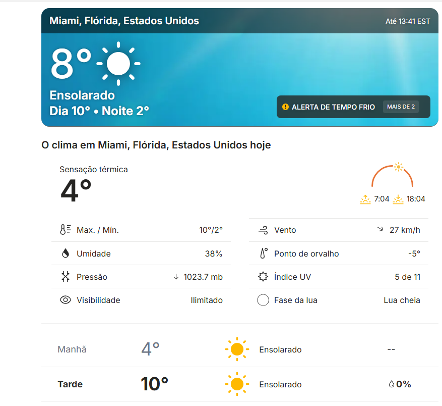 Renan Posted February 1, 2026 at 11:52 PM Share Posted February 1, 2026 at 11:52 PM Em 01/02/2026 em 15:54, pindorama disse: Bizarro! Aqui no Brasil em PoA e até mesmo Curitiba, somente em ondas de frio CAVALÍSSIMAS para dar 8ºC com céu limpo quase às 14h00. E mesmo naquela onde de frio de 2000, por aqui tivemos 11,xºC neste horário com sol. E nem é uma onda de absurdamente bizarra, imaginem se fosse no nível da de 1899! Pelo que li nesse site de notícias, Miami registrou a menor temperatura desde Dezembro de 2010. Ou seja, foi uma baita onda de frio mesmo, daquelas raras ! https://www.local10.com/weather/2026/02/01/florida-freeze-coldest-weather-in-years-brings-mid-30s-temps-mid-20s-wind-chills/ 2 Quote Link to comment Share on other sites More sharing options...