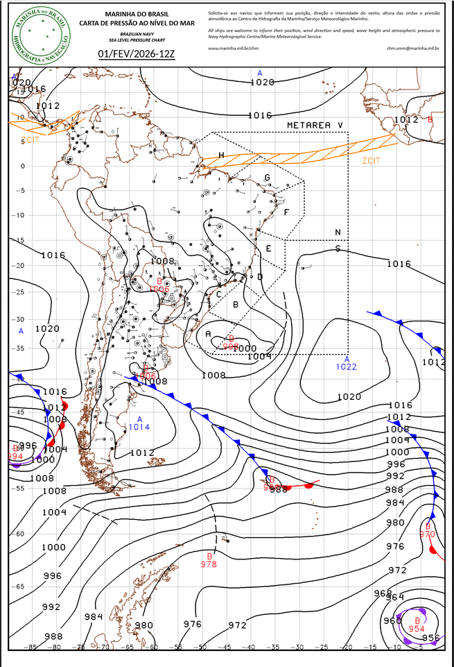 Felipe Backendorf Posted February 1, 2026 at 07:04 PM Author Share Posted February 1, 2026 at 07:04 PM Muito calor onde ainda sopra o vento continental do ciclone, como em Blumenau onde faz 35,0ºC com 44% e venta de O a 8km/h às 16h Em Floripa refrescou com o vento marítimo, após máxima de 30,9ºC, fazia 28,3ºC às 15h com vento de SSE a 9km/h. Carta da marinha 12Z: 12 Quote Link to comment Share on other sites More sharing options...