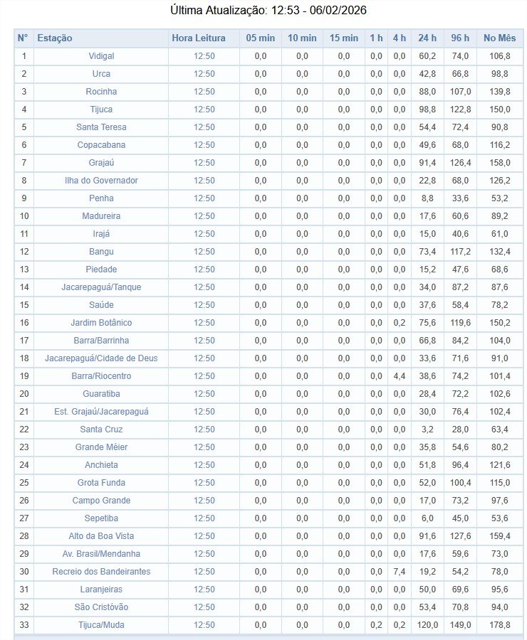 pauloribrj Posted February 6, 2026 at 04:04 PM Share Posted February 6, 2026 at 04:04 PM Em 06/02/2026 em 02:08, Evandro O. disse: Você é dos meus, KKKKKKKKK. Sim. Tmj! kkkkkk Começo de tarde com sol entre nuvens no Rio e um pouco abafado. A noite anterior foi de bastante chuva, principalmente depois das 23h, com bons acumulados pela cidade, principalmente no entorno do Maciço da Tijuca, zona sul e alguns pontos da zona norte e oeste como Anchieta e Bangu. Ontem na Vila Militar (INMET) a temperatura variou de 22,0°C a 32,2°C com precipitação acumulada nas últimas 24h (12h00 de ontem até hoje) de 40,4mm. Acumulados do Alerta Rio nas últimas 24h: 8 Link to comment Share on other sites More sharing options...