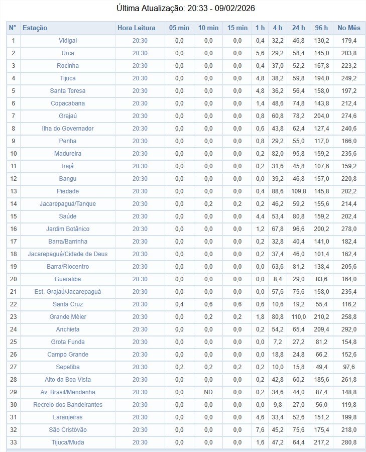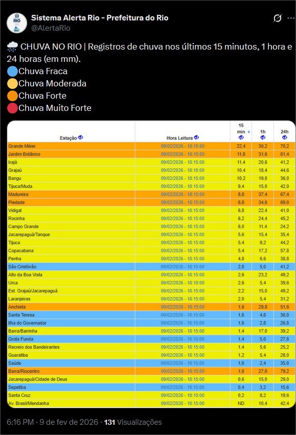 pauloribrj Posted February 9, 2026 at 11:44 PM Share Posted February 9, 2026 at 11:44 PM (edited) Em 09/02/2026 em 20:12, Darley disse: Já tem estação do Alerta Rio com quase 300mm neste mês em menos de 10 dias. Das 33 estações do Alerta Rio, 19 já superaram os 200mm. Vila Militar já tem o fevereiro mais chuvoso desde 2020 Sim e pelo jeito vai passar dos 300mm. Essa estação é a de Anchieta que fica a uns 900m da minha casa e já acumula 292mm. Da tarde de ontem até agora a noite já choveu mais de 100mm. Acumulados do Alerta Rio nas últimas 4h (16h30 - 20h30), com destaque para: Madureira - 82mm Piedade - 88,6mm Grande Méier - 80,8mm Edited February 9, 2026 at 11:44 PM by pauloribrj 8 Link to comment Share on other sites More sharing options...