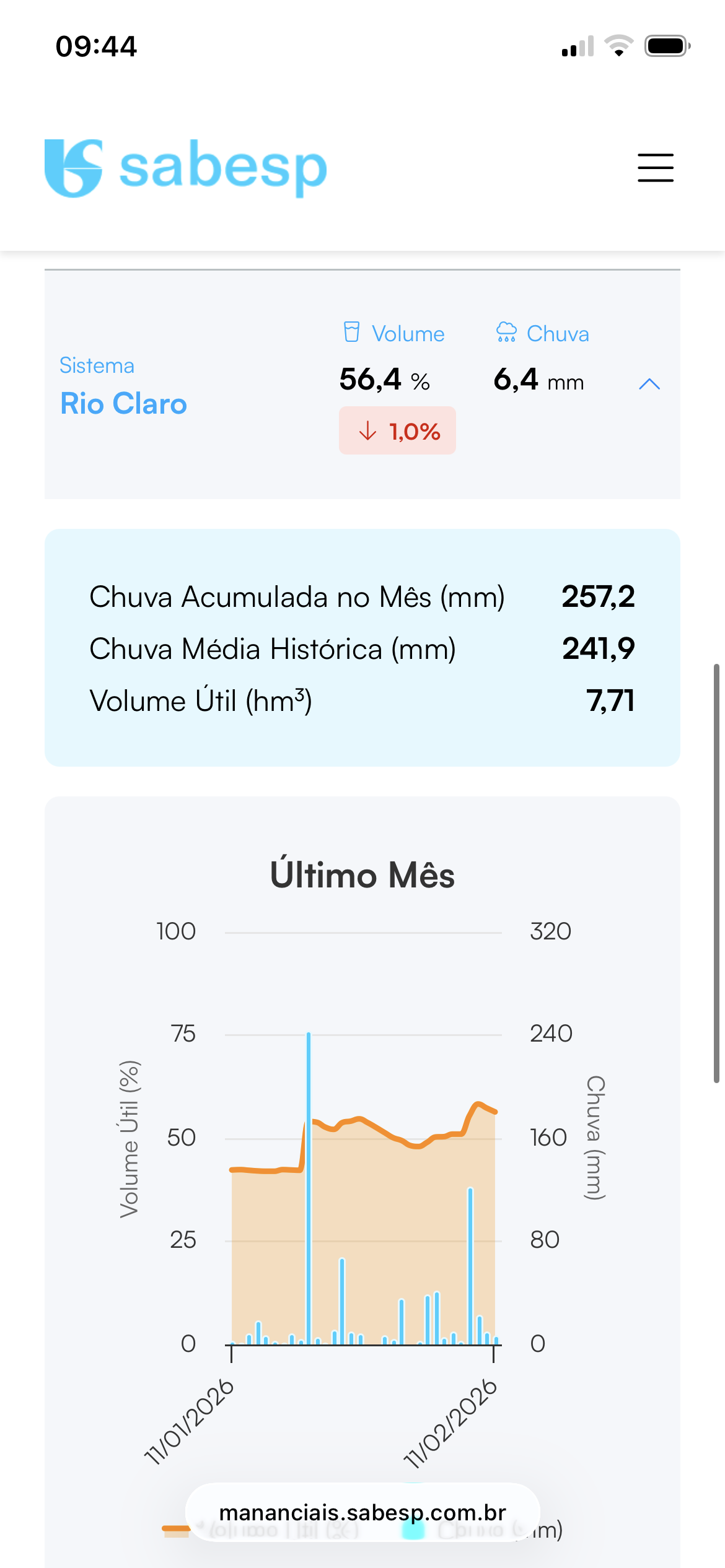 Wagner97 Posted February 11, 2026 at 12:51 PM Share Posted February 11, 2026 at 12:51 PM Alguém sabe me explicar o que acontece no sistema Rio Claro?? Mesmo chovendo a beça, o nível não sobe, e se chover pouco até cai! Esse sistema abastece aqui, e ele fica localizado em Biritiba Mirim, numa região que chove bem até no inverno (Julho, o mês mais “seco” tem média de 88mm). Não faz sentido… 8 Link to comment Share on other sites More sharing options...
