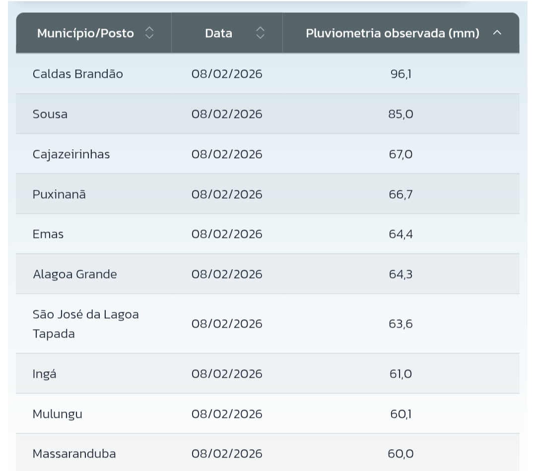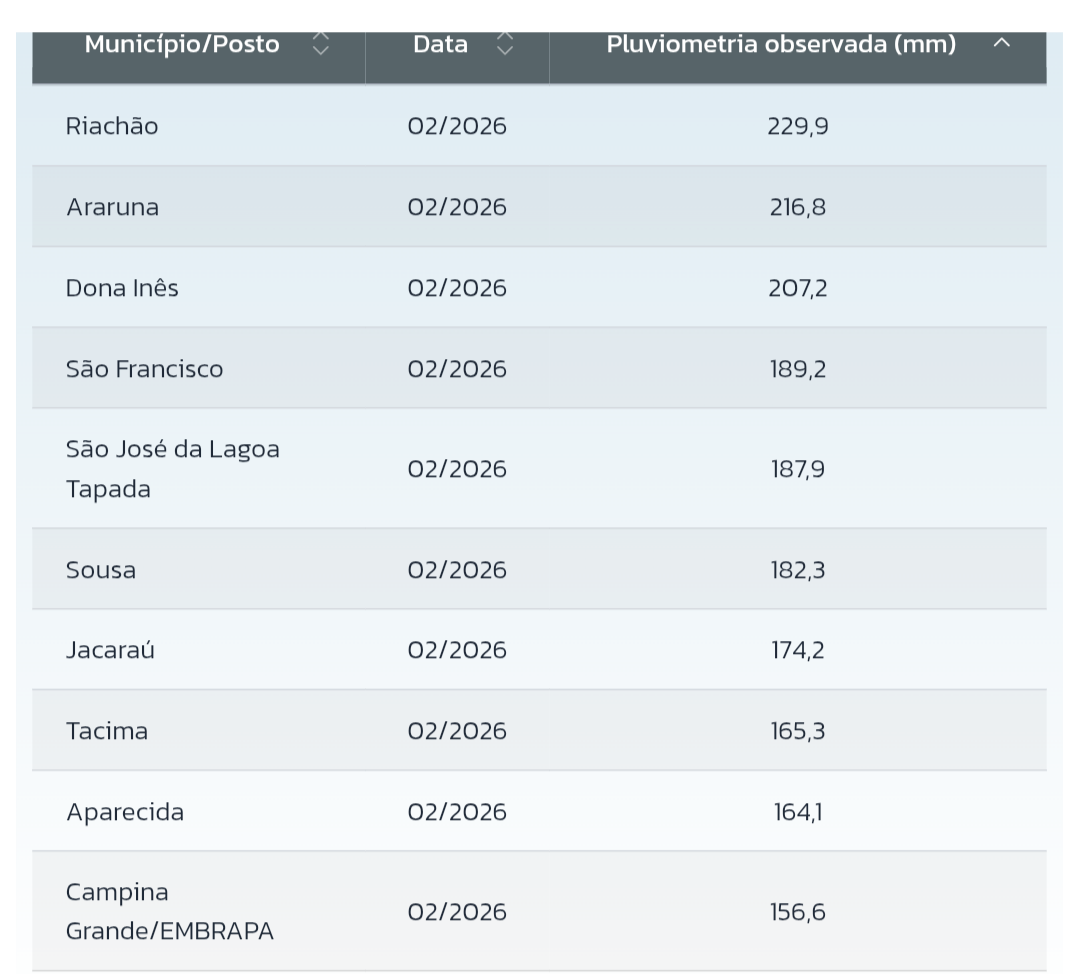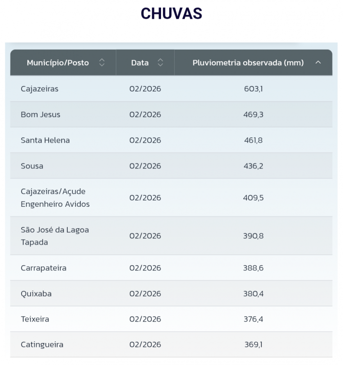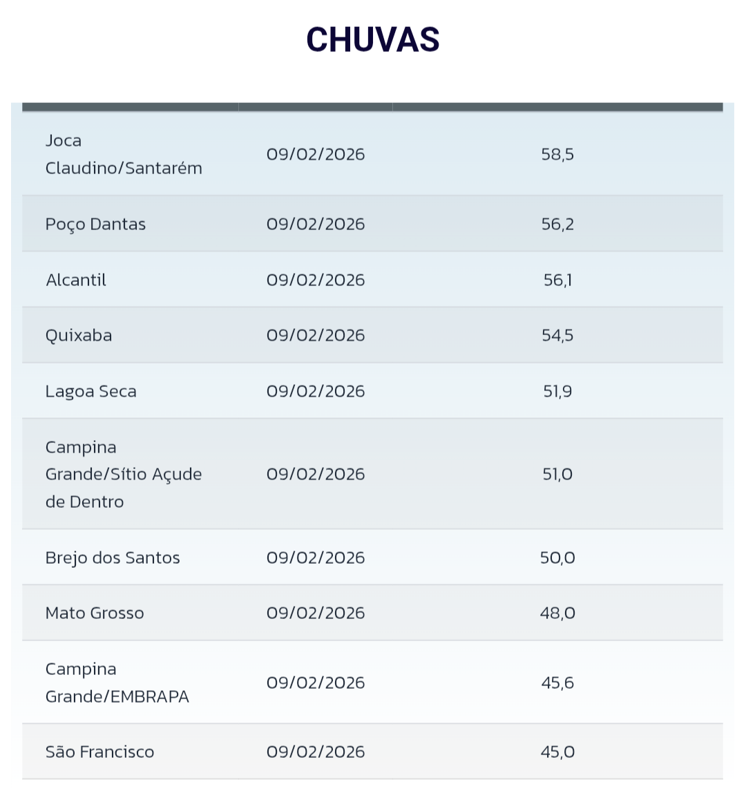 CloudCb Posted February 10, 2026 at 11:32 PM Share Posted February 10, 2026 at 11:32 PM (edited) O domingo (8) foi mais um dia instável no Sertão da Paraíba. A máxima em Pombal foi às 12h20, com 32,3°C registrados, pois depois desse horário foi só queda livre, chegando a apenas 23,3°C às 14h30! Em todo momento caía alguma garoa com ventos gelados vindos do quadrante norte. Mais ou menos de 17h ocorreram algumas pancadas um pouco mais encorpadas mas não passou da fraca intensidade. Os maiores volumes do Sertão foram registrados no norte e noroeste da região, segundo a AESA: Tive 5 mm ao todo nesse dia. No mês tenho 36,5 mm. Mas existem municípios do Sertão que já ultrapassaram a média de fevereiro, inclusive municípios do Agreste e Brejo que possuem médias menores neste mês: No momento há bancos de nuvens próximos da costa leste, no oceano: Pelas projeções, devem exercer influência no Sertão da PB a partir da quinta em diante: Projeção do GFS pra quinta (12) às 18h. Variáveis: ventos em superfície e água precipitável. Será, novamente, uma influência direta da ZCIT (assim como nesta última leva de chuvas). Edited February 10, 2026 at 11:35 PM by CloudCb 6 1 Link to comment Share on other sites More sharing options...
