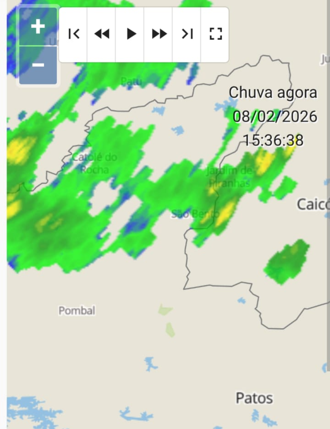 CloudCb Posted February 10, 2026 at 09:31 PM Share Posted February 10, 2026 at 09:31 PM O sábado (7) foi um dia marcado por instabilidades no Sertão da Paraíba. Em Pombal a quantidade de nuvens aumentou mais depois das 14h. A chuva veio com moderada intensidade pouco depois das 16h30, com alguns raios e fortes trovoadas. Essa chuva teve fim definitivo apenas na manhã do dia seguinte, no domingo, pendurando de forma intermitente e sempre com fraca intensidade, acumulando 17,8 mm em casa. Na região tivemos acumulados bastante significativos, como em Sousa, em Emas e em Cajazeirinhas, segundo a AESA: 7 1 Link to comment Share on other sites More sharing options...