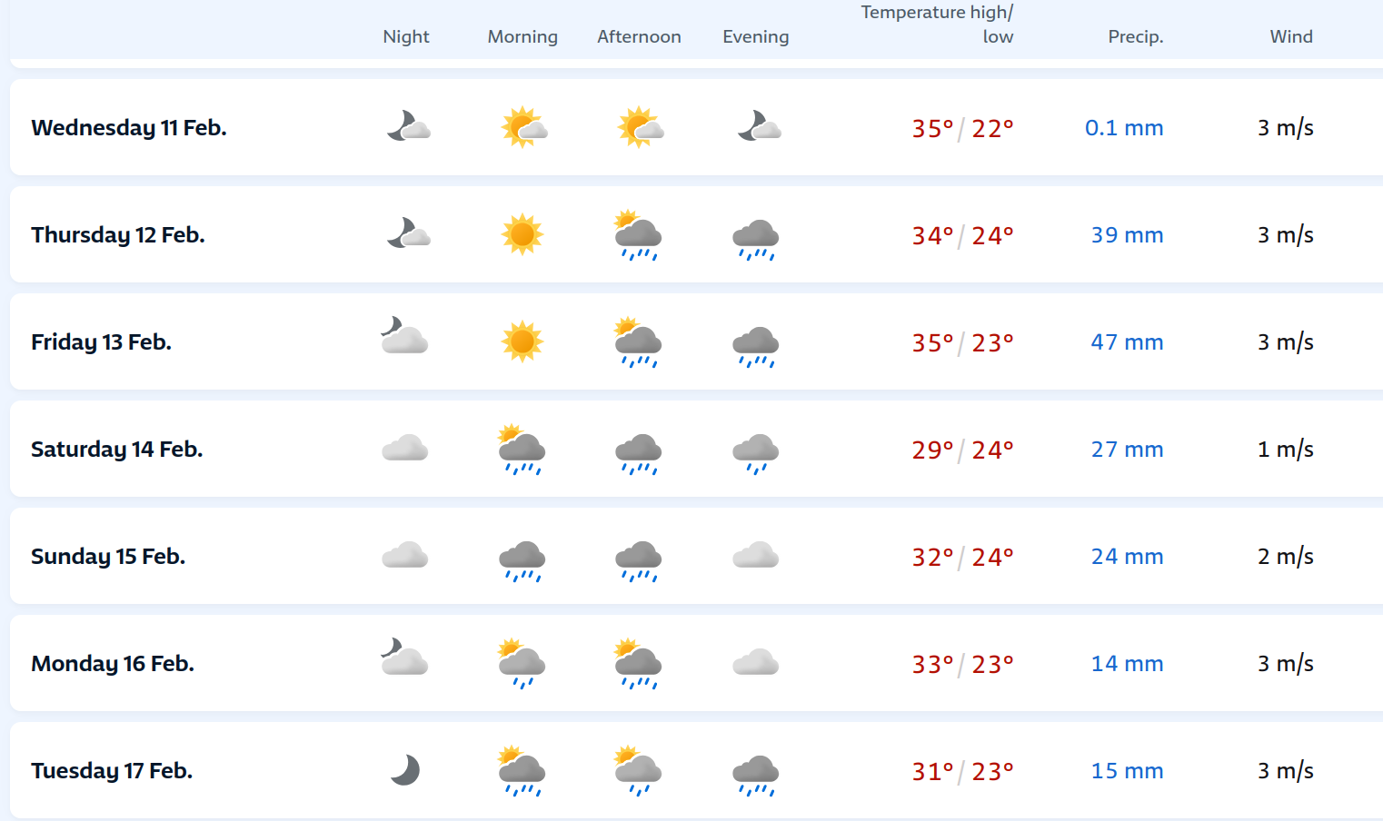 Edison Bocorny Jr Posted February 11, 2026 at 12:25 AM Share Posted February 11, 2026 at 12:25 AM Hoje aqueceu mais que ontem, tive sol, nebulosidade e uns pingos de chuva por volta das 15 horas. A mínima foi 22.7 e a máxima 34.3 graus. Já amanhã deve atingir 35 graus, devendo chover na quinta e sexta um pouco a tarde. 4 Link to comment Share on other sites More sharing options...