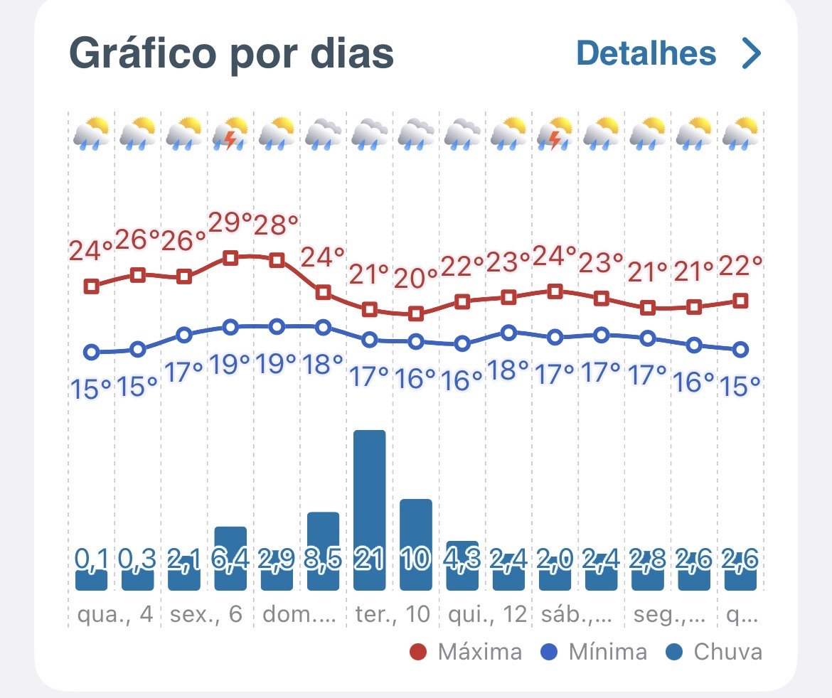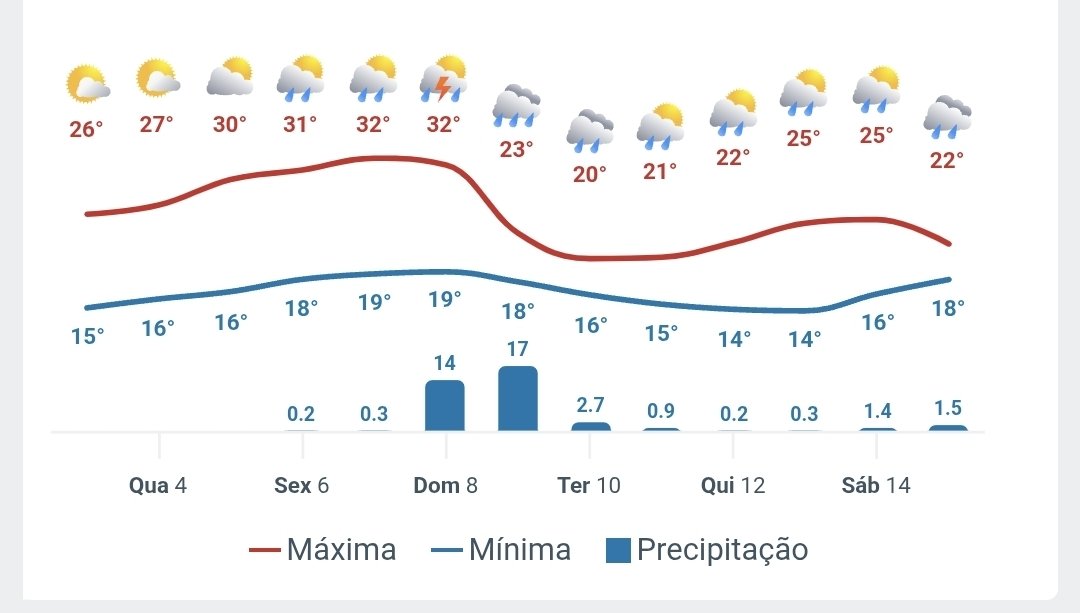 Rafael Posted March 4, 2026 at 09:54 PM Share Posted March 4, 2026 at 09:54 PM Boa Noite. Não sei se posso considerar uma mudança para o outono, mas as tardes não tem sido mais as mesmas em relação a jan/fev aqui na Serra. Do dia 1° de março até hj (4) todas as máximas ficaram abaixo dos 27 graus na área urbana, o que já é um alivio e o conforto térmico é excelente. E a partir do dia 9 desse mês as máximas devem ficar ainda mais baixas devido a chuva. Quanto as mínimas já subiram novamente, hj foi de 17 graus aqui em casa. 4 Quote Link to comment Share on other sites More sharing options...