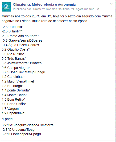 deividbecker Posted May 2, 2016 at 01:33 PM Share Posted May 2, 2016 at 01:33 PM As 5 Cidades mais frias em SC as 10h 8,5°C Mafra 8,6°C Rio Negrinho 8,6°C Vargem 8,8°C Otacílio Costa 9,4°C São Bento do Sul Em Indaial muito sol e 16°C Link to comment Share on other sites More sharing options...