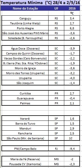 rosamelo Posted May 4, 2016 at 02:44 PM Share Posted May 4, 2016 at 02:44 PM (edited) Mínimas notáveis registradas entre 28 de abril a 2 de maio de 2016: Edited May 4, 2016 at 09:20 PM by Guest Link to comment Share on other sites More sharing options...