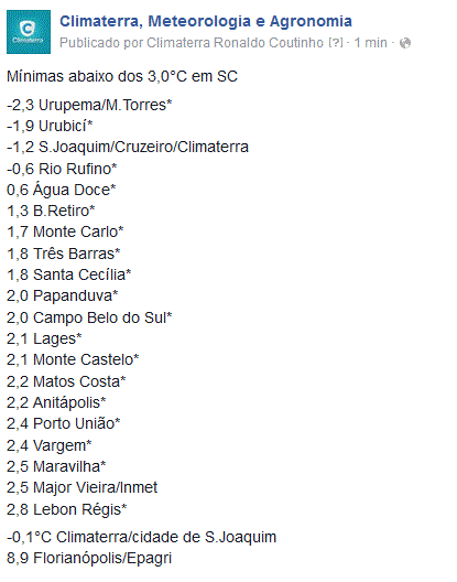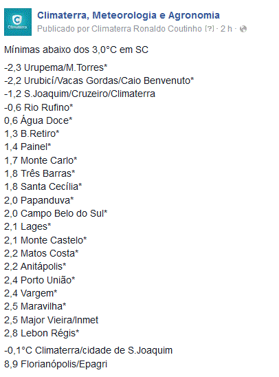 deividbecker Posted June 7, 2016 at 11:40 AM Share Posted June 7, 2016 at 11:40 AM As 10 cidades mais frias de SC as 8:30h -1,8°C Urupema -0,7°C São Joaquim -0,6°C Bom Jardim da Serra 0,2°C Rio Rufino 0,6°C Urubici 1,3°C Água Doce 1,7°C Três Barras 1,8°C Bom Retiro 1,9°C Painel 2,1°C Tangará Link to comment Share on other sites More sharing options...