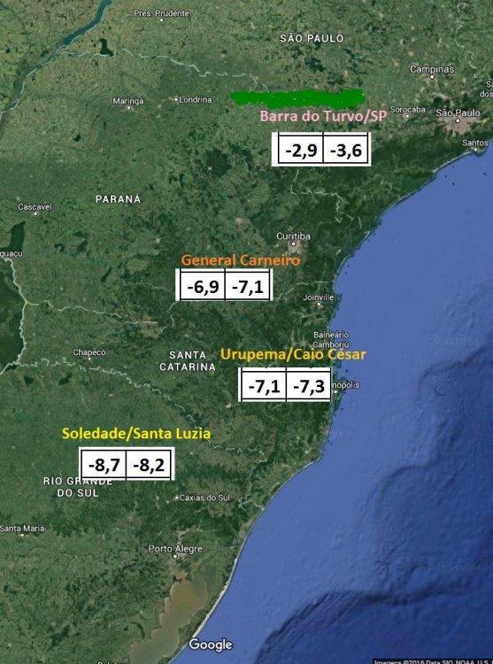 carlos soares Posted June 8, 2016 at 05:35 PM Share Posted June 8, 2016 at 05:35 PM Completando o post do Coutinho Minimas no litoral norte - SC, estaçoes da Epagri Schroeder: 3,5 ºC Corupá - 128 mts: 3,7 ºC Jaragua do Sul: 4,1 ºC Itapoa: 4,4ºC Massaranduba: 5,4 ºC Garuva: 5,8 ºC Corupá - 321 mts: 5,9 ºC Joinville - Vila nova: 7,4 ºC Joinville - Pirabeiraba: 8,2 ºC Link to comment Share on other sites More sharing options...