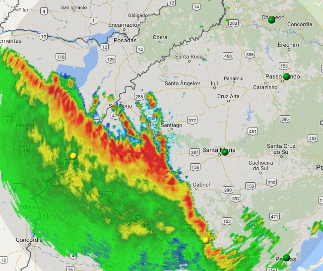 Rodolfo Alves Posted November 1, 2016 at 11:09 PM Share Posted November 1, 2016 at 11:09 PM Aeroporto de Uruguaiana reportou rajada de 102 km/h! Edit: Itaqui, mais ao norte, já com rajadas de 80 km/h Alguns outros dados: Alegre: Rajada de 94km/h e 42mm de chuva em 1 hora. São Gabriel: Rajada de 85km/h Santiago: Chuva de 40mm em 1 hora. São Borja: Relatos de Bombeiros atendendo a várias ocorrências. Instituto Federal da Farroupilha com salas destalhadas. Fonte: METSUL/INMET ================================================================== Aeroporto de Santa Maria reportou as 20h10, rajada de 81km/h, no momento em que chovia forte com trovoadas e visibilidade de apenas 2000m. SPECI SBSM 012210Z [highlight=yellow]28023G45KT 2000 +TSRA[/highlight]BKN009 BKN020 FEW040CB BKN100 19/18 Q1005= Mais cedo, a pressão chegou a 998hpas ao nível da superfície do mar. METAR SBSM 012100Z 03011KT 9999 FEW040TCU BKN100 25/20 [highlight=yellow]Q0998=[/highlight] Link to comment Share on other sites More sharing options...