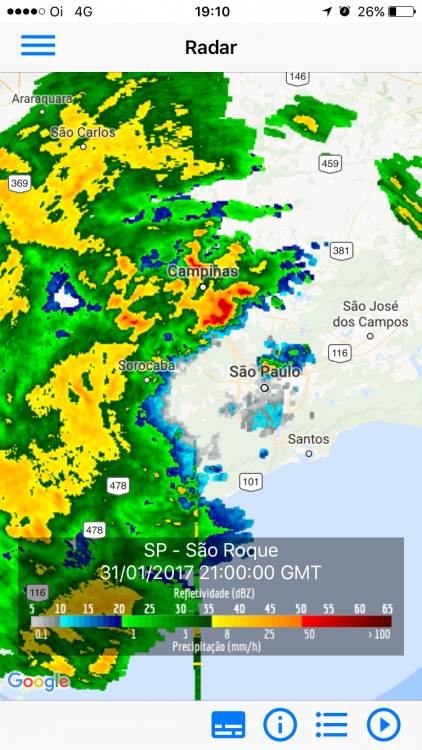 Aldo Santos Posted January 19, 2017 at 05:56 PM Share Posted January 19, 2017 at 05:56 PM Pessoal, segue a chuva pelo estado de SP. Grandes acumulados devem ser registrados nesta tarde e noite adentro. O radar está tomado de chuvas. Quantos dias é preciso para confirmar a formação de ZCAS? Para confirmação de ZCAS: 4 dias. ----------- Chove em boa parte da zona sul de Sampa. A estação do CGE-Capela do Socorro já acumula 54,6 mm. A estação CGE-M'Boi Mirim: 30,0 mm Aqui na zona norte, por enquanto só alguns "chuvisqueiros". Hoje tivemos sol (Entre nuvens) por aqui, no final da manhã e início da tarde. Link to comment Share on other sites More sharing options...
