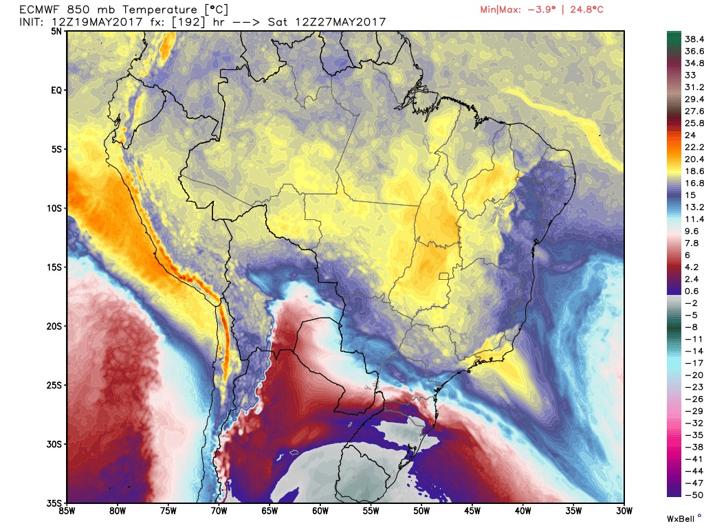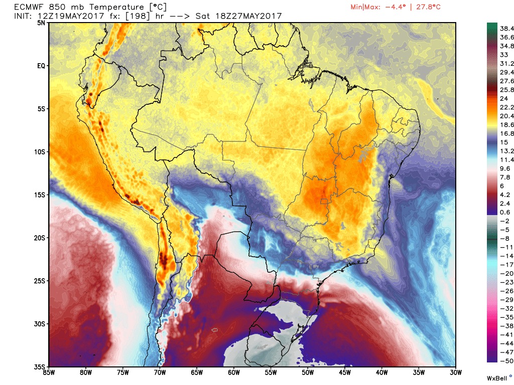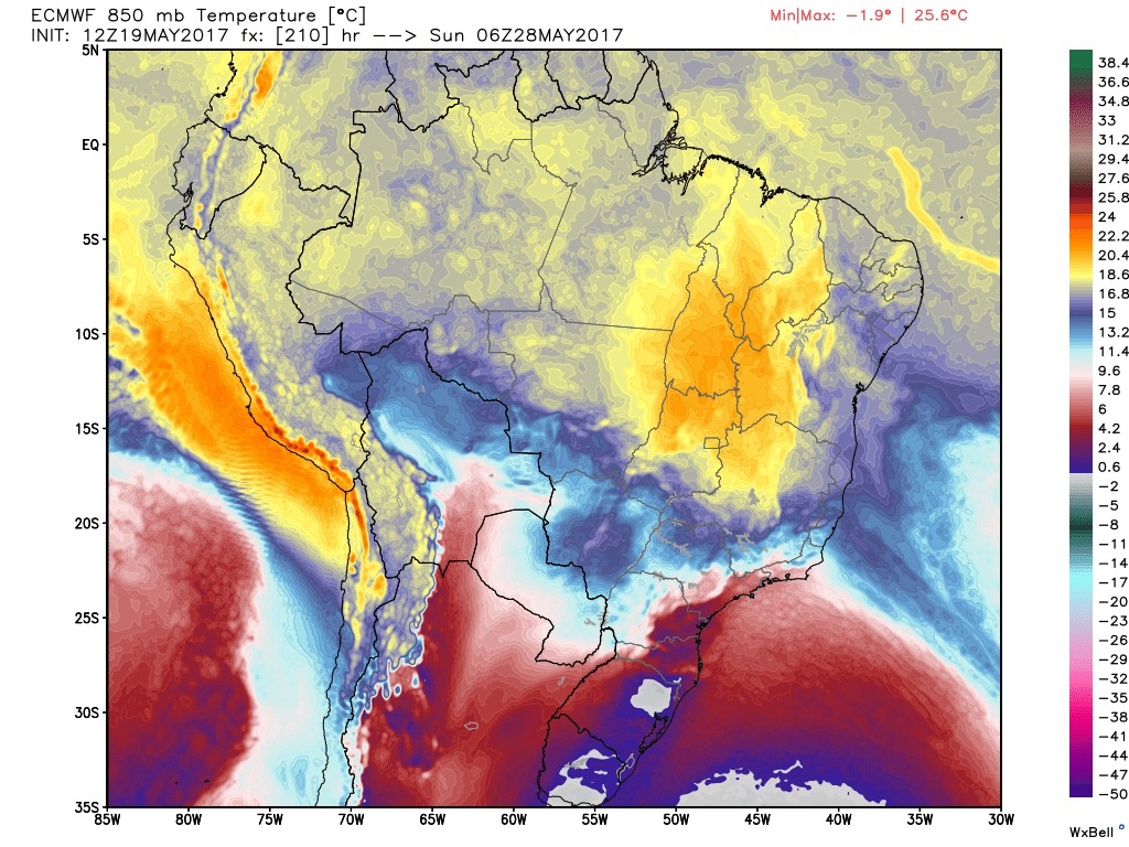 Andoni Posted May 19, 2017 at 09:53 PM Share Posted May 19, 2017 at 09:53 PM Renan, vi o rápido avanço da massa de ar frio no modelo Europeu 12Z entre a manhã de sábado(27) e a manhã de domingo(28), foi no mapa de temperaturas de 850hPa. Temperaturas de 18ºC a 20ºC em 850 hPa ás 9 da manhã de sábado no litoral sul, Vale do Paraíba fluminense,Parque de Itatiaia, cidade do Rio de Janeiro. Nos mesmos lugares citados acima a temperatura na manhã de domingo despenca para uma variação de 6ºC a 8ºC em 850 hPa. Vi também... Meteograma do GFS 12Z aqui: Tarde de sábado: 28C (na prática uns 28/30) Tarde de domingo: 14C... CHAMEM O SAMÚ [3] --------------- Até às 17h, choveu 32 mm em casa, ainda continua chovendo. Variação de 16,2 a 19,2 (máxima ontem às 21h) Outros acumulados: Barra do Piraí/Santa Cecília: 26,1 mm Barra do Piraí/Vargem Alegre: 26,2 mm Mendes/Cemaden: 33,2 mm Valença/INMET: 25,8 mm Resende/INMET: 24,8 mm Rio Claro/INMET: 31,8 mm Três Rios/INMET: 21,0 mm Link to comment Share on other sites More sharing options...