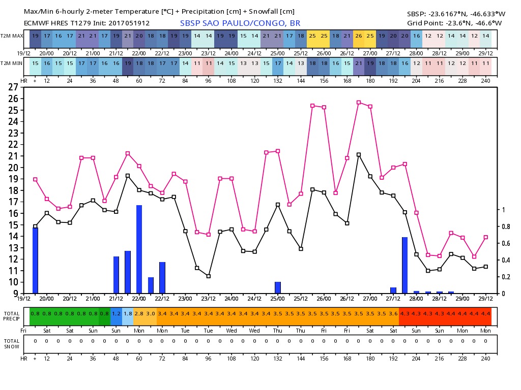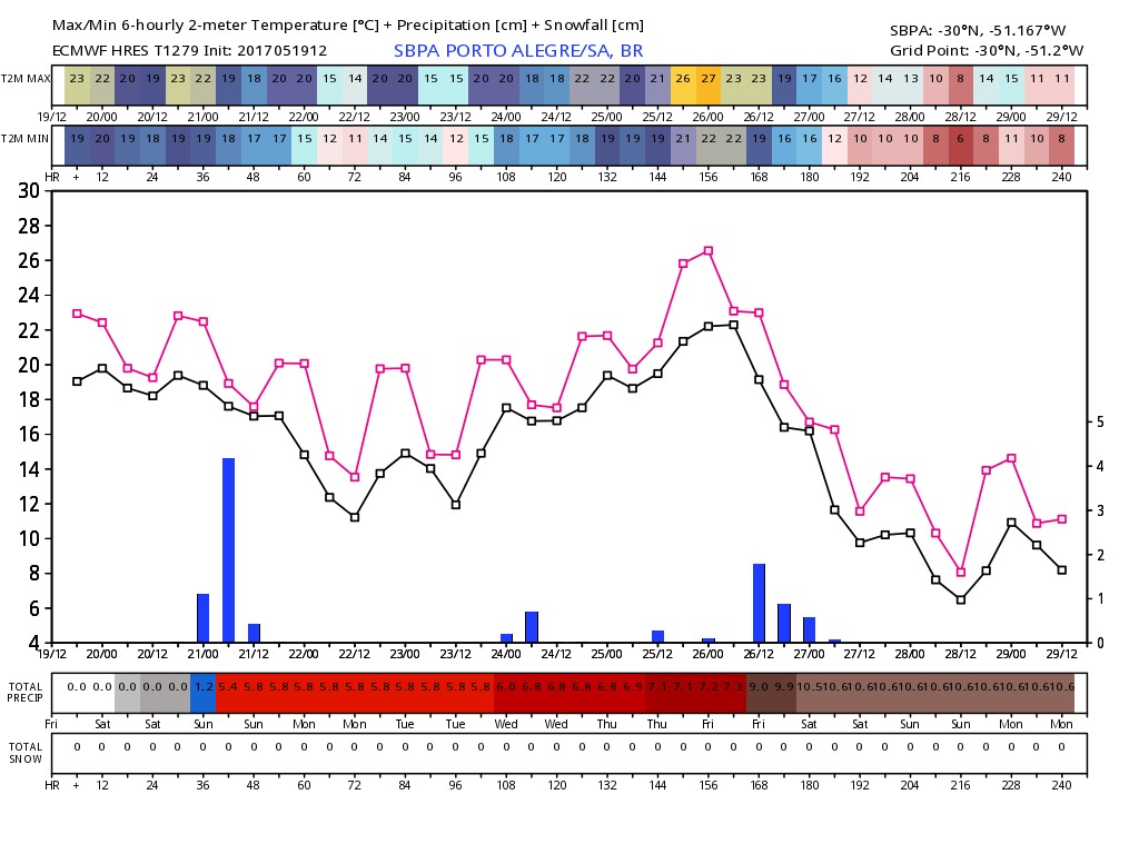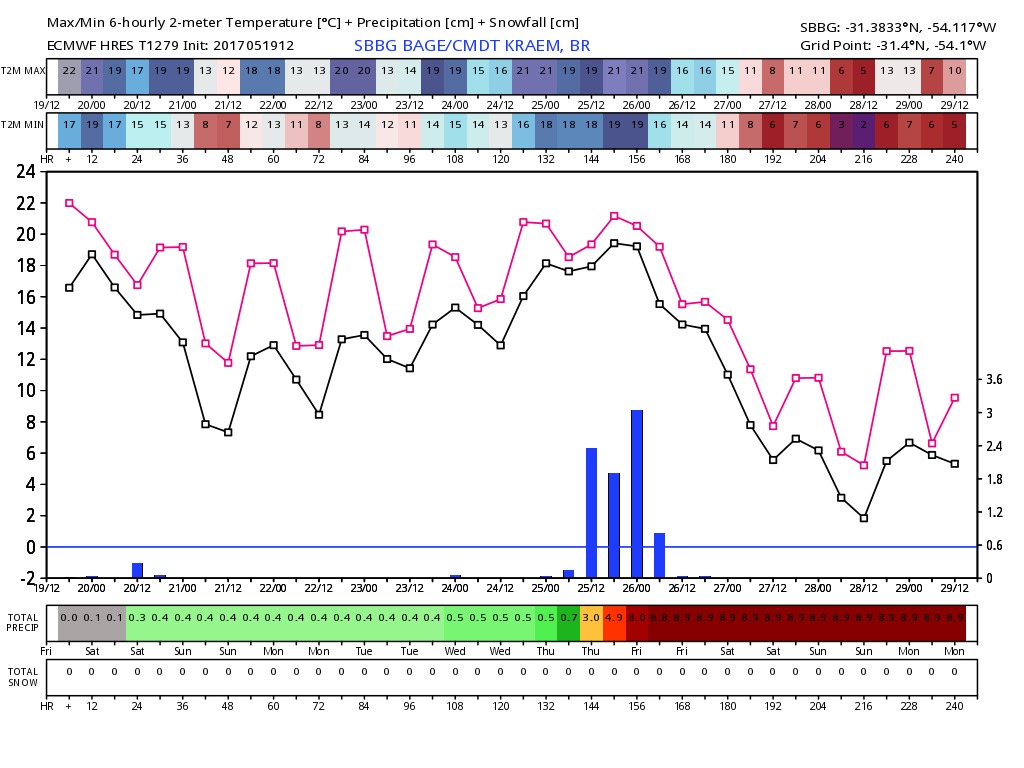 Tomás WRuas Posted May 19, 2017 at 09:03 PM Share Posted May 19, 2017 at 09:03 PM Meteograma do GFS aponta 0,8°C pra Porto Alegre dia 29 e o ECMWF bruto (super conservador em mínimas pra cá) 6°C já pra dia 27. Pra São Joaquim, o meteograma dá -5,8°C! CHAMEM O SAMU! Link to comment Share on other sites More sharing options...