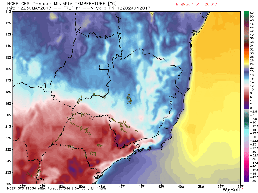 Renan Posted May 30, 2017 at 01:43 PM Share Posted May 30, 2017 at 01:43 PM Nani, A estação de Caparaó registrou o excelente valor de 07,0ºC hoje cedo, dados da Convencional. Já Barbacena anotou 09,5ºC. Acho que vamos ter ótimos valores neste Sábado, com possível geada nas baixadas mais propícias. Link to comment Share on other sites More sharing options...