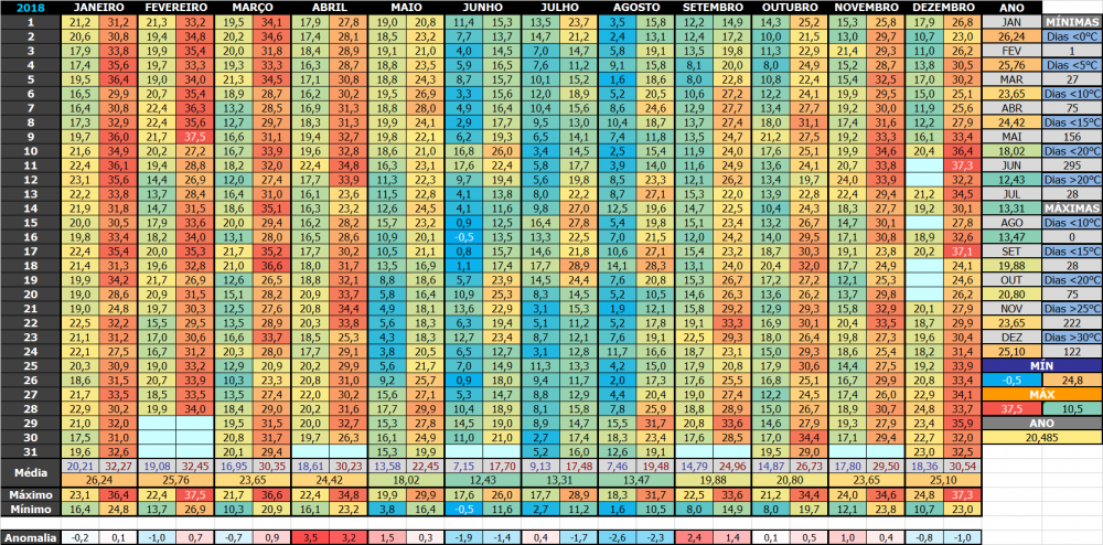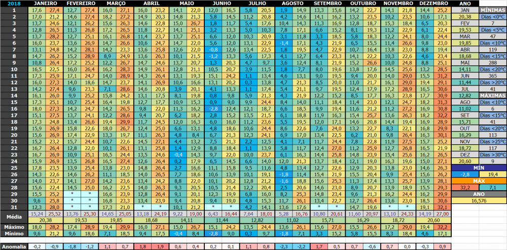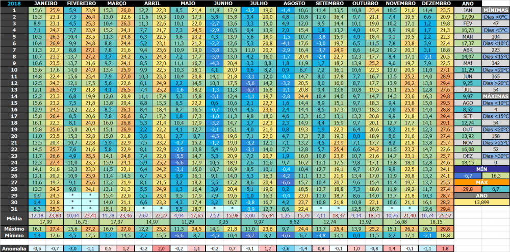 Andoni Posted August 10, 2018 at 01:19 AM Share Posted August 10, 2018 at 01:19 AM JULHO 2018 NO SUL DO RJDados diários: Daqui de casa: Máximas em itálico, usei da aut de Valença. Problema no abrigo. Tive que usar a automática de Resende. A convencional só reporta mínimas. E mês passado, só reportou até o dia 11/07... Horário UTC em todas as estações. 4 Link to comment Share on other sites More sharing options...