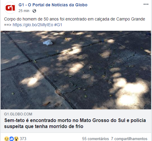 Lucas Venturini Posted August 12, 2018 at 02:59 AM Share Posted August 12, 2018 at 02:59 AM A sensação do que é frio depende do que como você está, e não apenas de onde está. Frio de 7º pode ter sido a causa da morte de um andarilho em Campo Grande/MS: 3 Link to comment Share on other sites More sharing options...