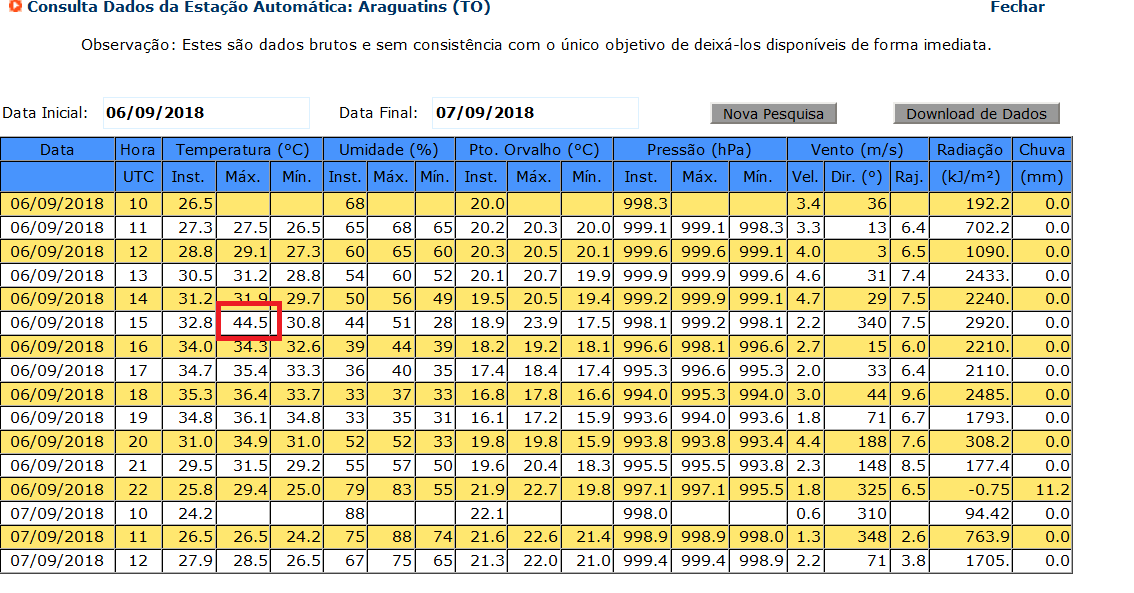 CloudCb Posted September 7, 2018 at 12:48 PM Share Posted September 7, 2018 at 12:48 PM A maior máxima ontem, segundo a filtragem do Inmet, foi de 44,5°C em Araguatins. Por ter registrado tal valor, eu fui verificar a veracidade do dado, se fosse verdade entraria na lista dos recordes. Mas não passou de um erro na estação ↓. 4 1 Link to comment Share on other sites More sharing options...