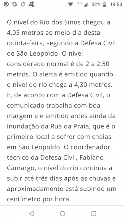 Tavares Posted May 25, 2019 at 03:35 AM Share Posted May 25, 2019 at 03:35 AM 12 minutos atrás, PabloMartins disse: É disso que estou falando. Fizeram um alarde enorme pra região metropolitana de Porto Alegre e o que aconteceu? 50mm de chuva quarta, 15 na quinta e praticamente NADA na sexta, o vento nem a 40 km/h atingiu kkkkk. essa "empresa conhecida", tive problemas com ela em Outubro de 2014, quando comentei em meu twitter que com base do que eu estava vendo nos radares daquela época, havia um tornado na fronteira do RS com a Argentina. Inclusive tenho provas da minha publicação da época. Gente tinha um baita gancho no radar, roxo/violeta/rosa. 30 mim depois eles me bloquearam nas redes sociais e fizeram uma baita comentário meio que menosprezando meu conhecimento (de 18 anos kkk) e como se eu fosse a pessoa mais desinformada e etc da face da terra. No dia seguinte eles tiveram a cara de pau de falar sobre um tornado que havia atingido a vizinha Argentina e detalhe, eles falaram que ELES informaram da possibilidade. Uma palhaçada. Ah e outra, essas respostas que eles dão as pessoas sempre foram grosseiras, sempre, mesmo agora que eles exigem que tu pague no mínimo "X" reais pra ter informações detalhadas, que possam proteger famílias e vidas... É complicado. Agora em Canoas, vizinha à Porto Alegre e cidade onde resido, tem um vento que sopra em fracas rajadas (acho que mal chega a 20 km/h), tempo nublado e algo em torno de 14 ou 15°C. Eu também tô bloqueado de todas as redes sociais desse "blogue" e pelo mesmo motivo. 4 Link to comment Share on other sites More sharing options...