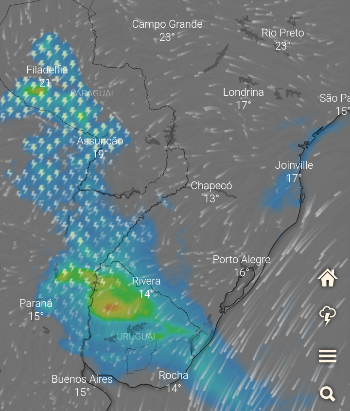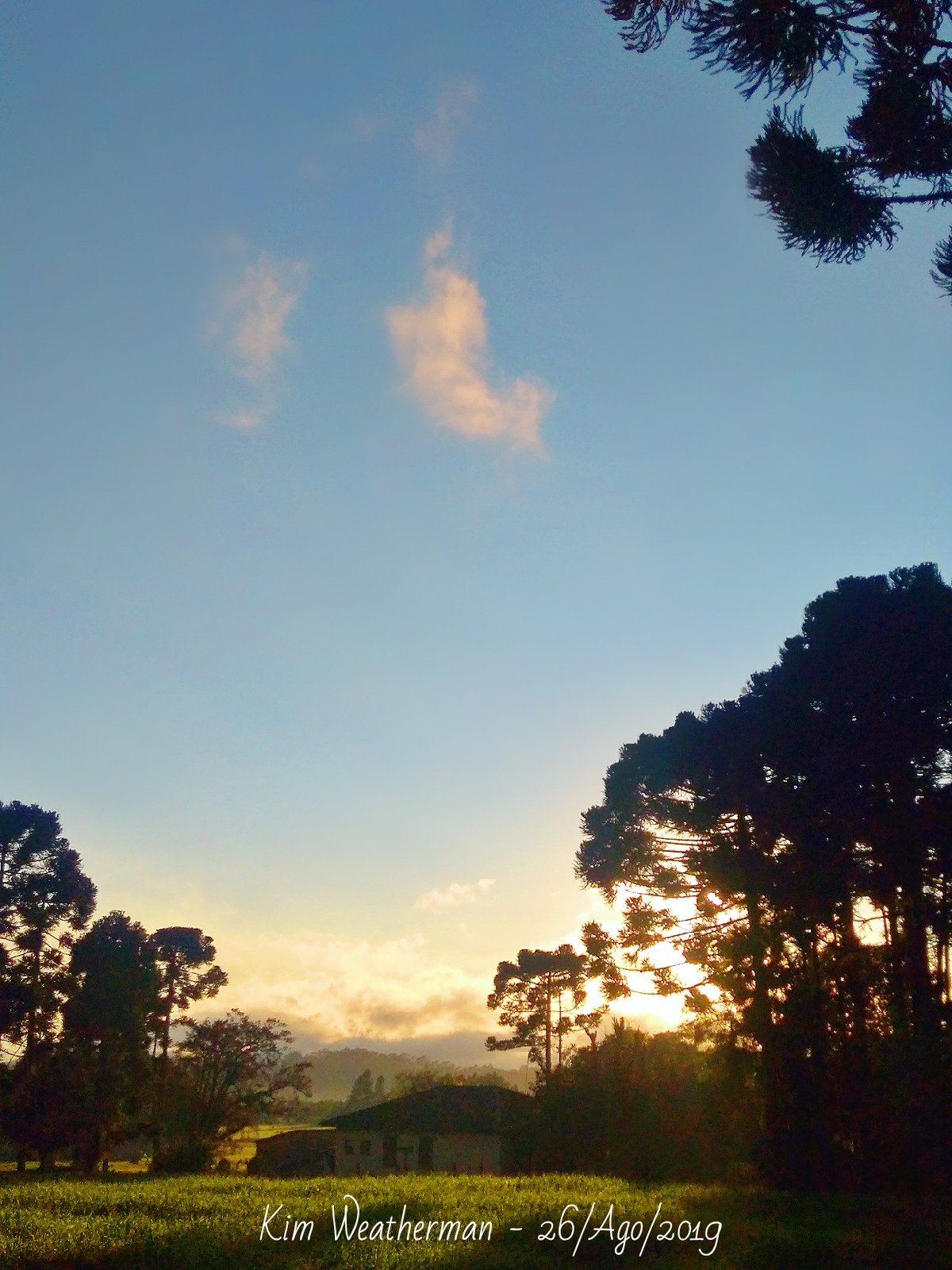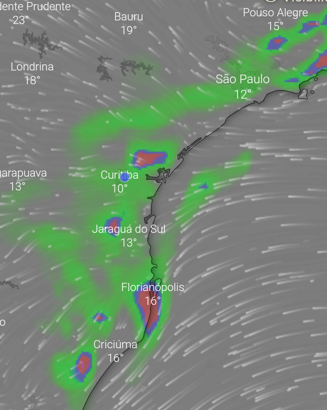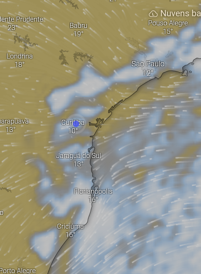 Carlos Campos Posted August 26, 2019 at 10:54 AM Share Posted August 26, 2019 at 10:54 AM Dia começando com pouca nebulosidade, porém a madrugada foi de céu nublado e com vento constante. A temperatura sofreu uma ligeira elevação já na noite de ontem e só houve keda perceptível ao amanhecer. Agora, 8°C e sol, mas não deve durar muito. Os ventos em altitude continuam a transportar nuvens, umidade e até garoa do oceano até às montanhas e parte do planalto leste. Em 1.500m, o Morro Bradador em Garuva reportou há pouco, vento de 76 km/h e garoa, com 7°C. O amanhecer foi bonito por aki: Enquanto a situação tende a melhorar aki no extremo leste (espero), uma grande área de mau tempo atinge o Uruguai, parte do RS e se estende até o centro do Paraguai. Às 6h desta manhã muita gente deve ter se assustado com o barulho dos trovões.. 4 1 Link to comment Share on other sites More sharing options...